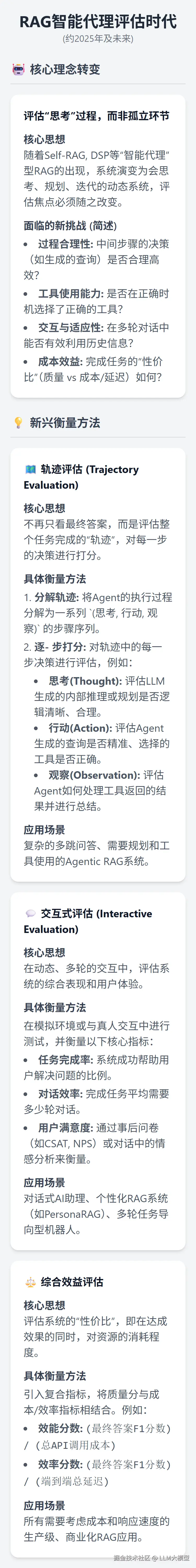 - 趋势:随着Agentic RAG的复杂化,评估也必然走向“阶段三”。企业会越来越关注综合效益,我们讨论过的轨迹评估(评估决策链的好坏)和成本效益评估(衡量API成本、延迟和答案质量的综合“性价比”)将成为评估复杂RAG代理的标准。
