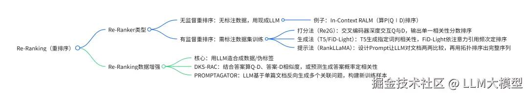 要怎么对材料做重排?要么就是训练一个新的模型(Re-Ranker)去专门承担这个任务;要么就是调用一个现代大语言模型去帮忙甄别;在调用现代大语言模型的时候还可以顺带利用它生成大量的合成数据,或者把它作为“教师模型”蒸馏它的知识。