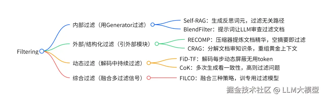 动态过滤:这类方法的过滤行为不是在生成答案之前一次性完成的,而是动态地、持续地发生在LLM的解码(生成答案)过程之中。
