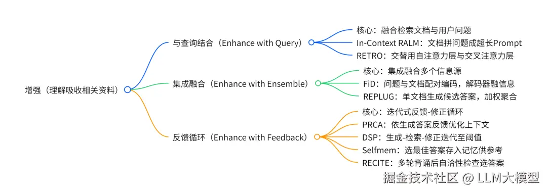 与查询结合(Enhance with Query):这是最基础直接的方法。其核心是将检索到的文档和用户问题简单地、直接地融合在一起,然后进行处理。重点在于融合的机制。