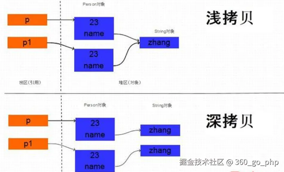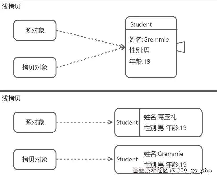 - 浅拷贝(Shallow Copy):拷贝对象的引用,复制的是对象的内存地址,修改引用对象的属性会影响原对象。