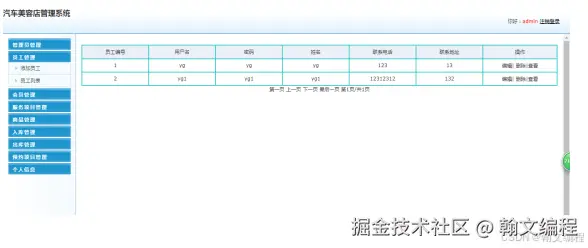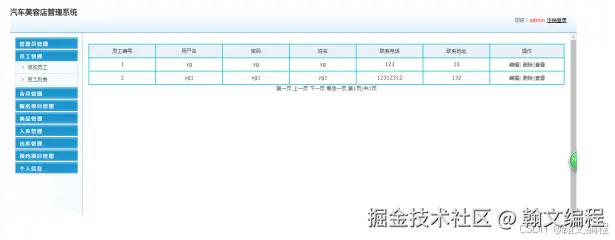 该功能用于实现对系统员工信息的管理。可以添加、删除和更改员工信息,以及员工信息列表展现,在添加员工信息时,系统会自动查询系统中员工表中的员工编号字段,系统自动将员工表中最大值加1作为该员工表员工记录的员工编号,同时将员工编号,用户名,密码,姓名,联系电话,联系地址 信息添加到员工信息表中;在删除一条员工记录时,先选中一条员工记录,将该条员工记录中的员工编号作为查询条件在员工信息表中进行查询,弹出“确定要删除吗?”的对话框,若是,则执行删除操作,否则退出删除操作;在更改员工记录时,先选中一条员工记录,将员工信息显示在相应的修改页面中,然后更改后保存到员工信息表中;查看员工信息记录时,选中要查看的员工记录,系统根据用户选择员工信息,在详细页面显示员工信息,如图所示:
