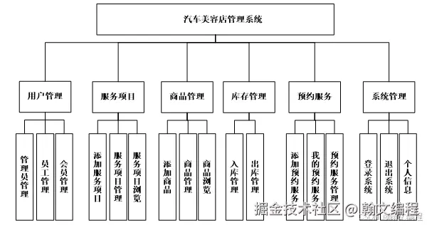 汽车美容店管理系统主要设计了系统管理商品管理、库存管理、预约服务管理等功能,满足用户在网站上面进行汽车美容店的信息浏览与查看,具体功能模块图如4.1所示: