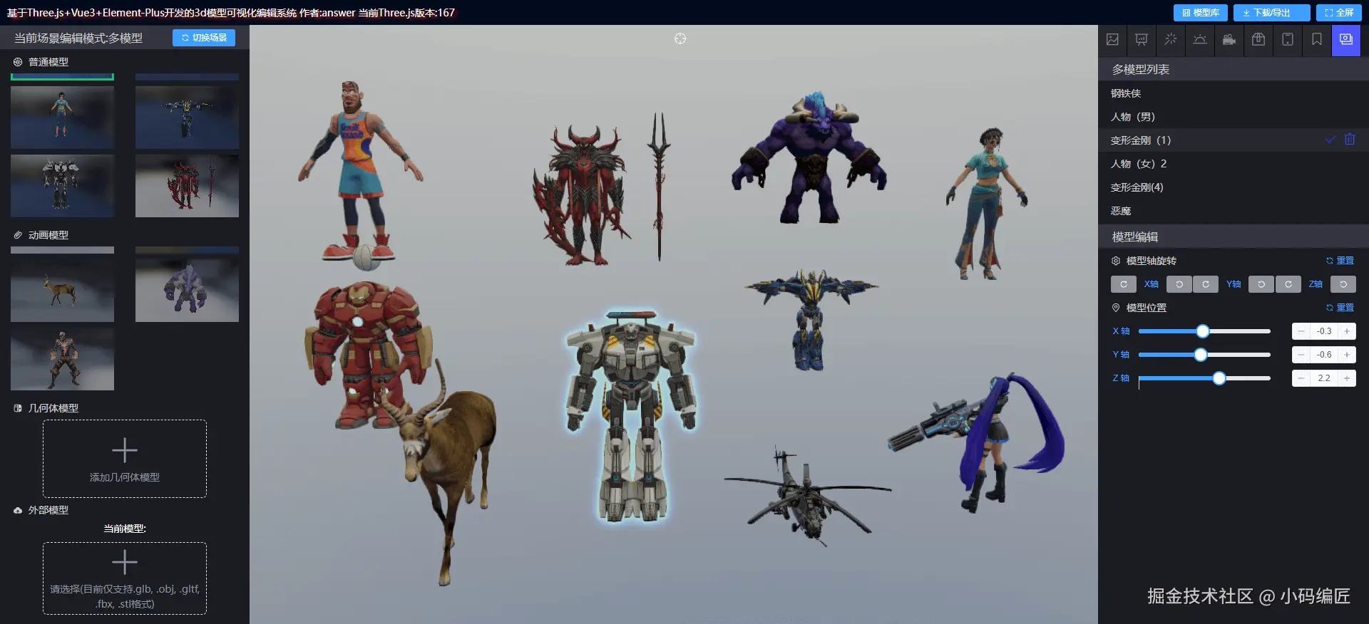 支持多模型的选中、位置调整、轴旋转和大小缩放。