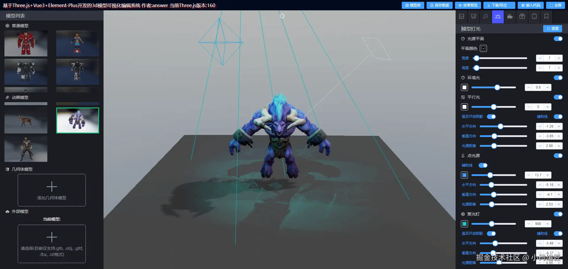 lightModules.js:管理场景中的各类灯光,如环境光、平行光、点光源和聚光灯。animationModules.js:处理模型的动画播放、控制以及绕轴旋转等操作。stageFlowModules.js:提供辉光(bloom)等后期特效,并支持模型拆分、材质拖拽等功能。helperModules.js:提供模型旋转、位置移动等变换控制,以及网格、坐标轴等辅助工具。manyModelModules.js:实现对多个模型的选中、删除、统一变换(位置、旋转、缩放)等批量管理功能。
