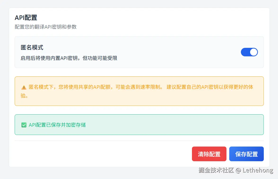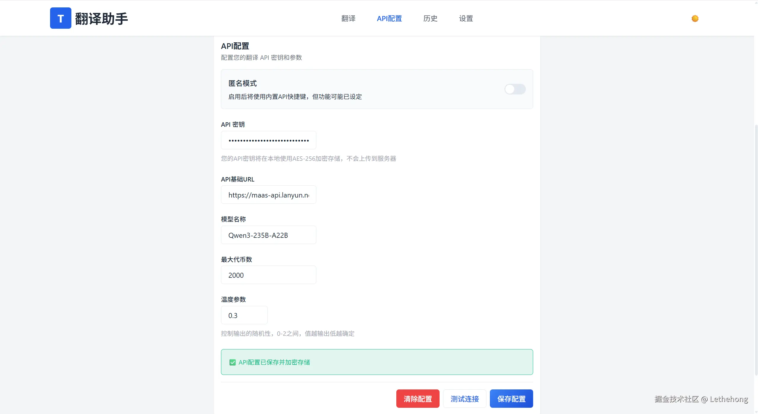 https://maas-api.lanyun.net/v1/chat/completions端点发送POST请求完成,请求中包含了模型路径、系统角色设定和用户待翻译文本等信息。 - 灵活的密钥管理:项目设计了专门的API配置模块,允许用户安全地注入和管理自己的蓝耘平台API Key。这支持了个人模式与匿名试用模式并存的灵活使用策略。