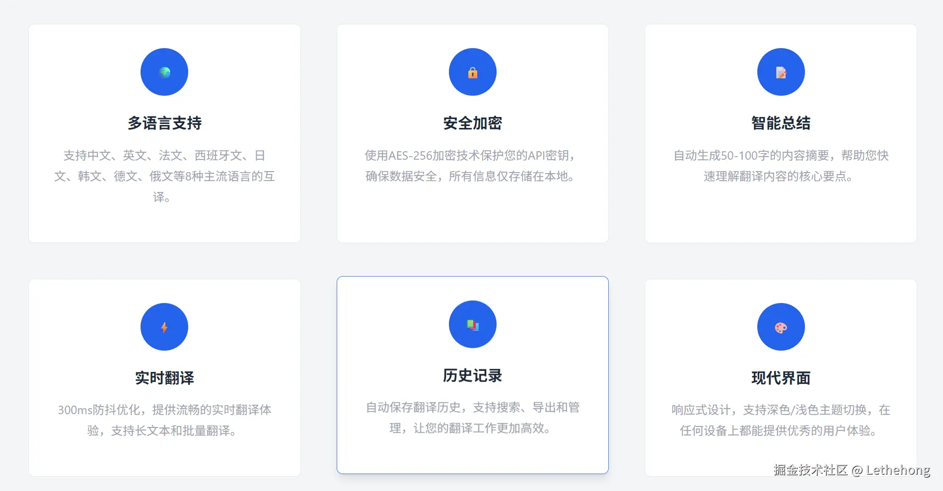 - 历史与摘要:利用LRU算法保存最近的翻译记录,并支持对翻译结果生成简洁的内容摘要。