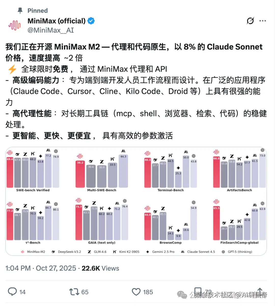 昨天刷X的时候,看到MiniMax官方账号发了一条新动态,正式发布了他们最新的旗舰模型:MiniMax-M2。