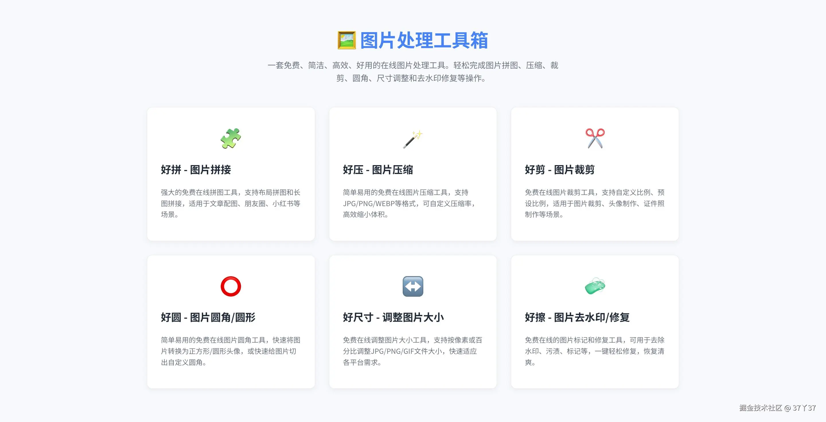 之前开发了一个「免费在线拼图工具-好拼」,因简洁好用得到了不少朋友的喜欢,同时也收到了许多的新需求,有需要去水印的,有需要制作正方形/圆形头像的,还有要图片压缩的等等
