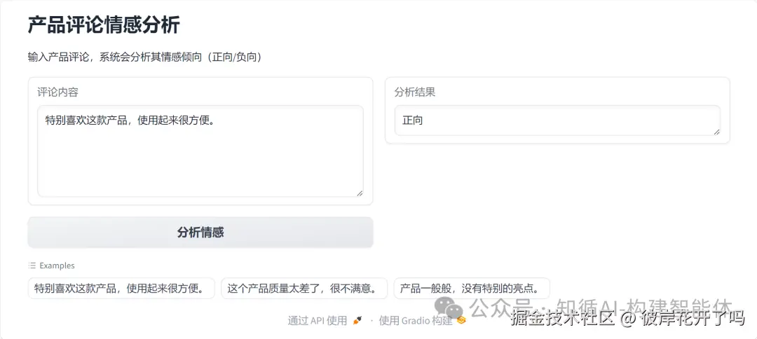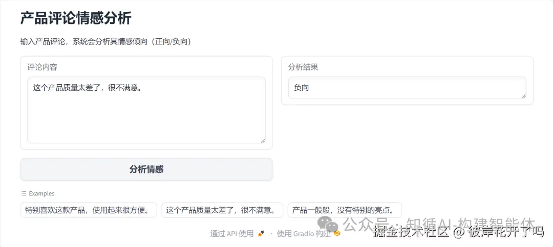 gr.Markdown("输入产品评论,系统会分析其情感倾向(正向/负向)")