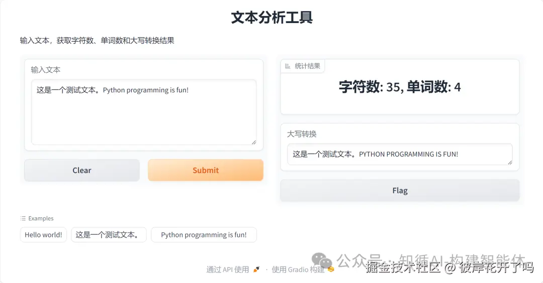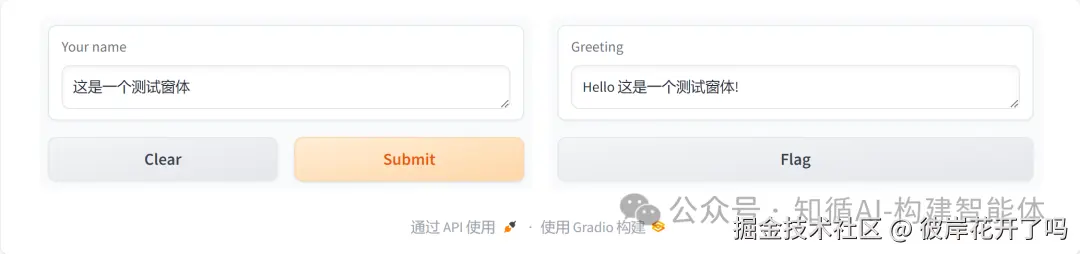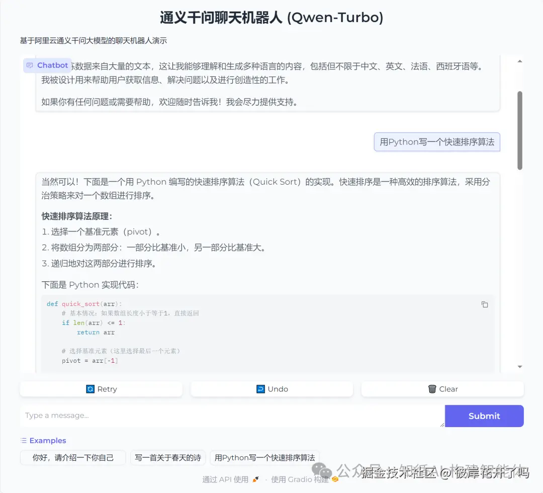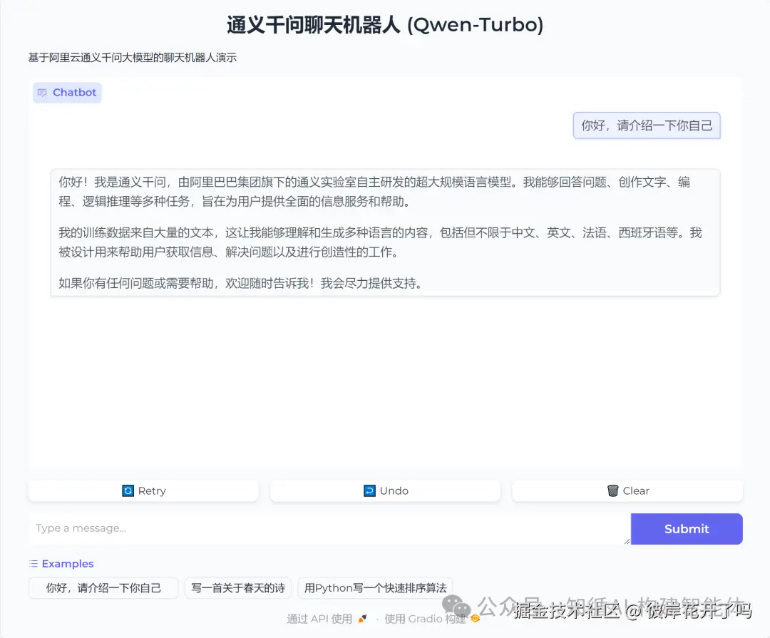 本示例结合第一篇文章《构建AI智能体:一、初识AI大模型与API调用》中的示例,采用gradio组件开放调用,可以了解前后方式的差别;