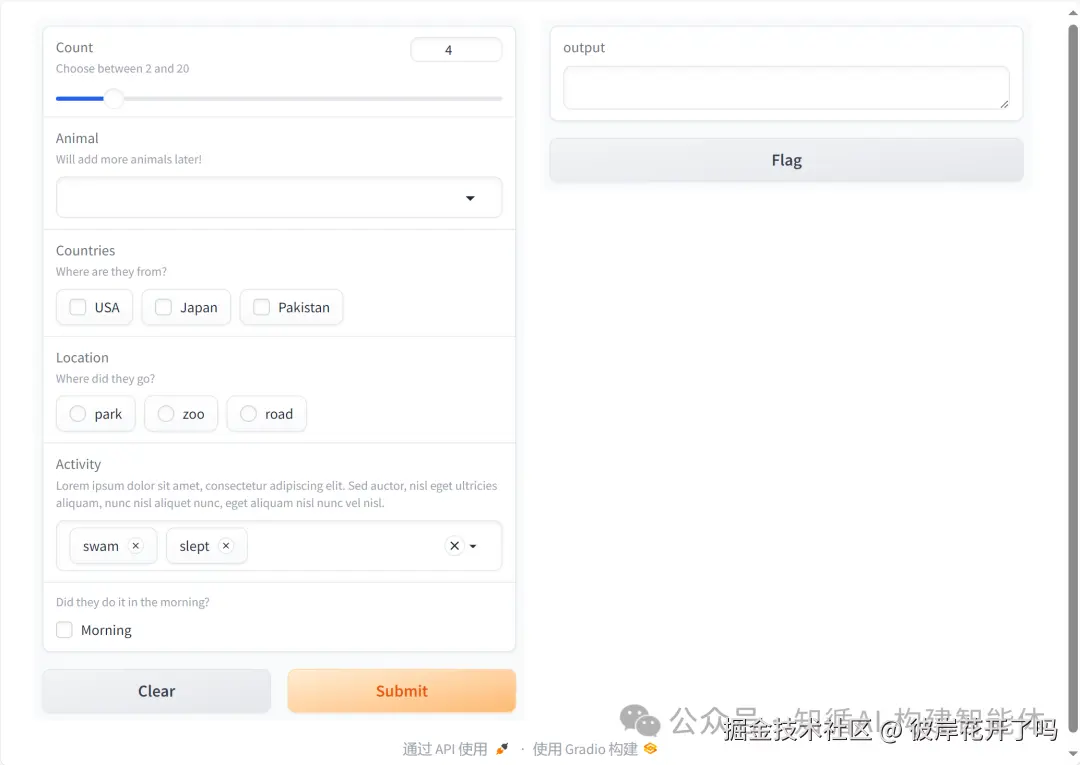Gradio提供了丰富的输入输出组件:
