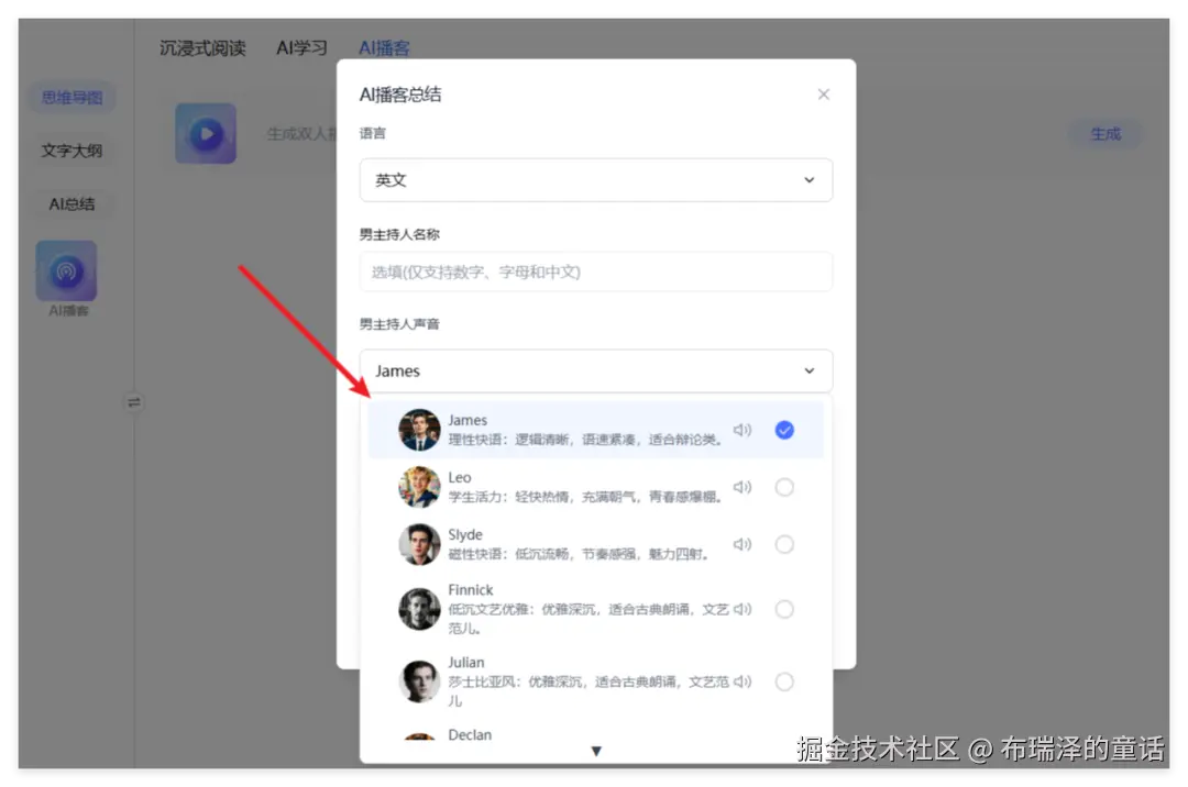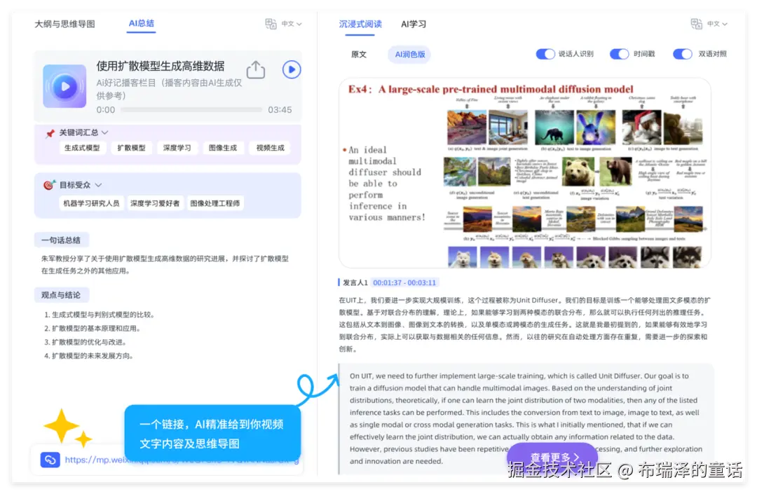 无论是什么视频,它能为你生成双语选择、多种人声可选的专属播客,随时可听。