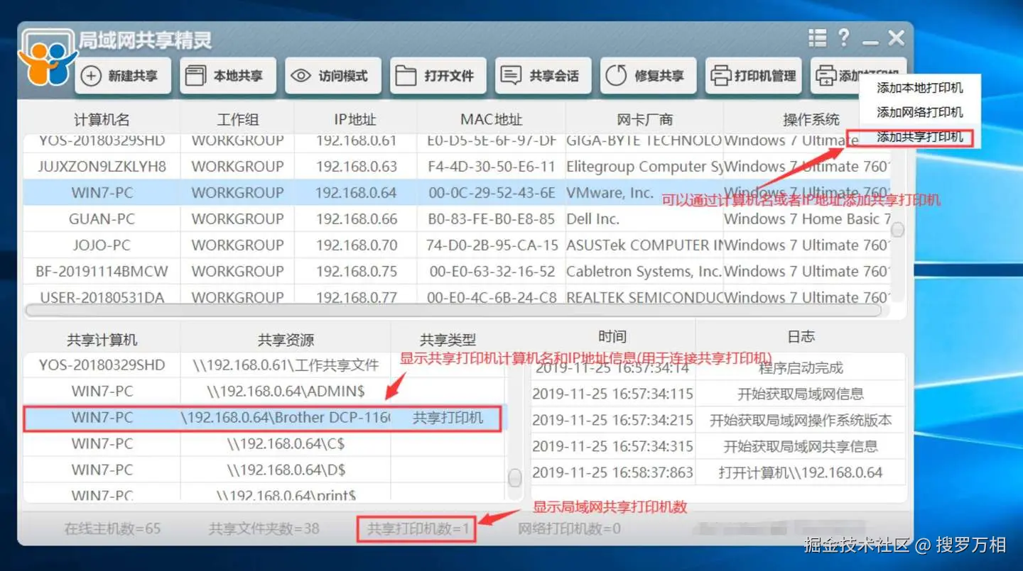 添加网络的时候,可以看到左侧能看到分享打印机的IP,直接复制过来就行了。