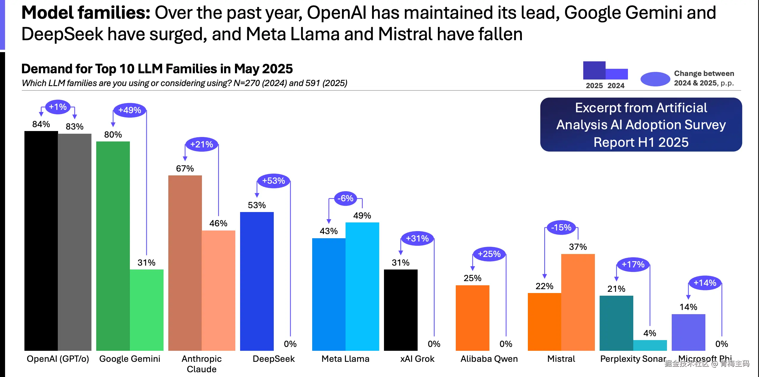采用率调查显示(N=591企业),OpenAI GPT系列达 84%,xAI Grok 飙升 49 个百分点至 31%,Google Gemini 升 21% 至 67%,DeepSeek 暴增 53% 至 46%。Meta Llama 和 Mistral 略降,但整体开源选项活跃。