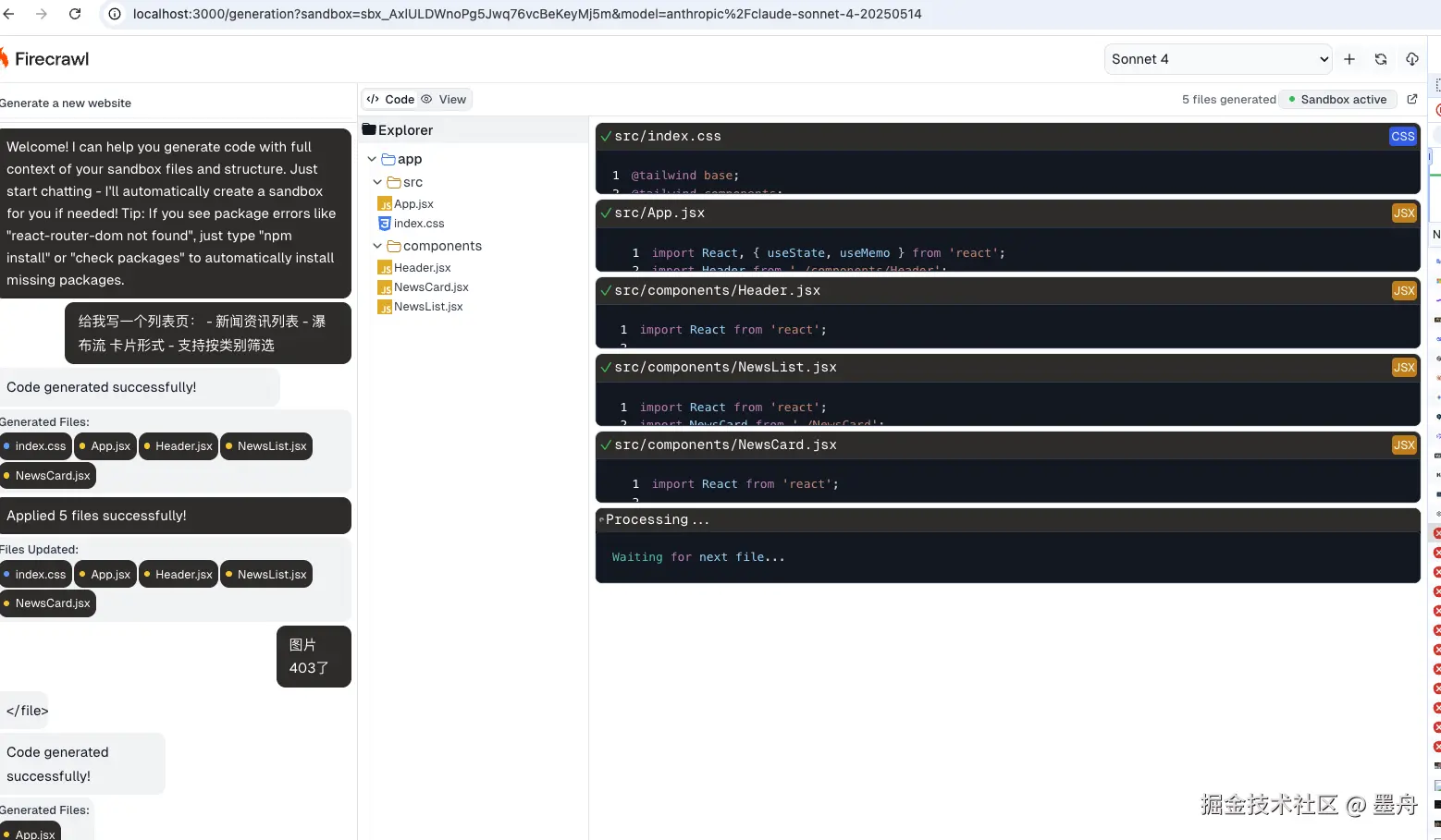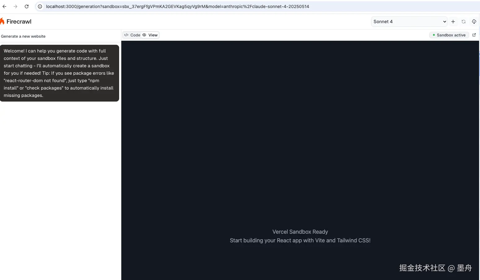 如果不用网站抓取能力的话,可以直接到这个生成页面:http://localhost:3000/generation。 进来之后,沙盒会自动加载,如下图所示就说明沙盒环境也准备好了