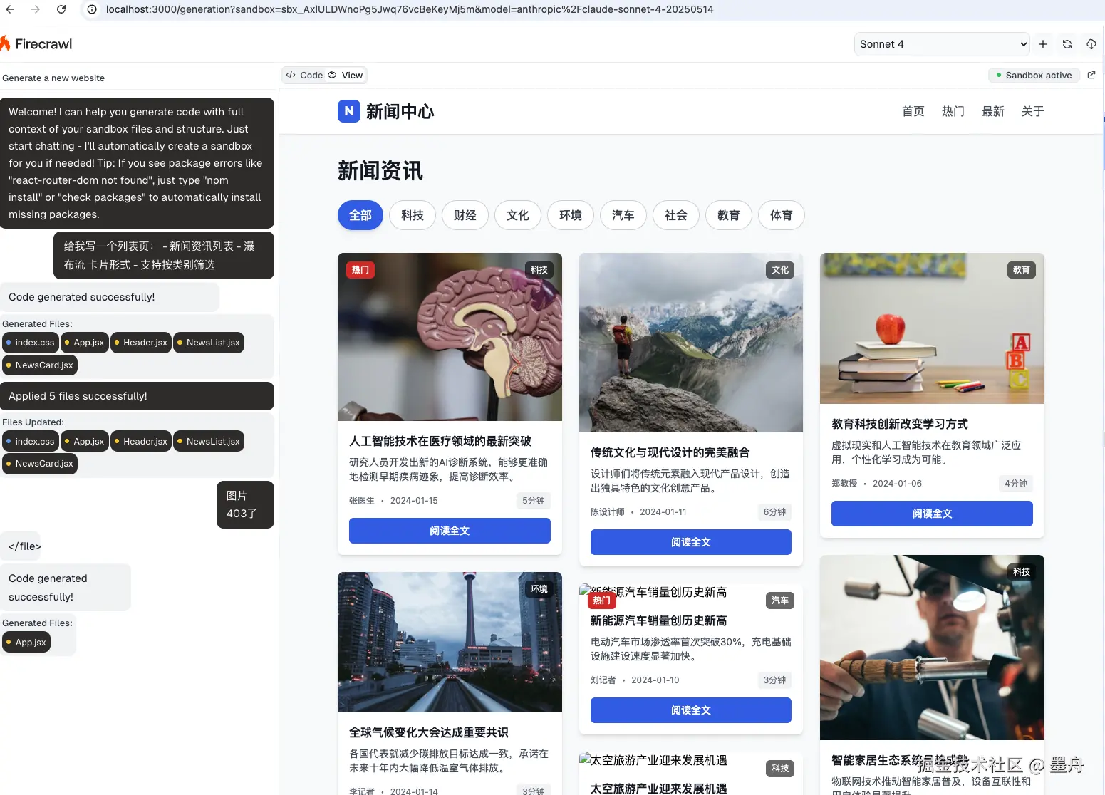 接下来我们来测试下生成的效果怎么样,我让它:写一个列表组件,新闻资讯列表、瀑布流卡片形式、支持按类别筛选。看看效果吧