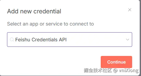 配置凭证:还是 点击 Create Credential,搜索 Feishu,选择 Feishu Credentials API
