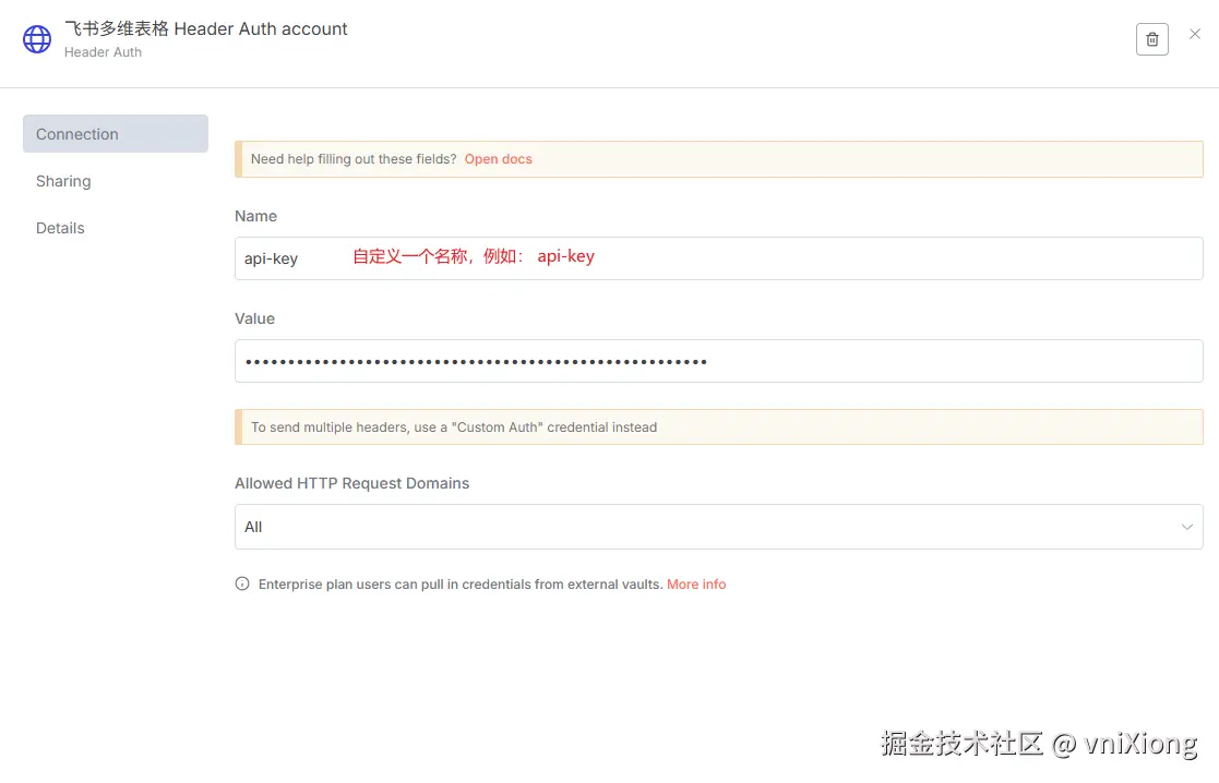 配置 飞书多维表格 Header Auth account:自定义 name 和 value,name 可以叫 api-key, value 可以是随机生成的一串随机数,或者你自定义的密码,后面在飞书webhook那里会用到作为header 请求校验。