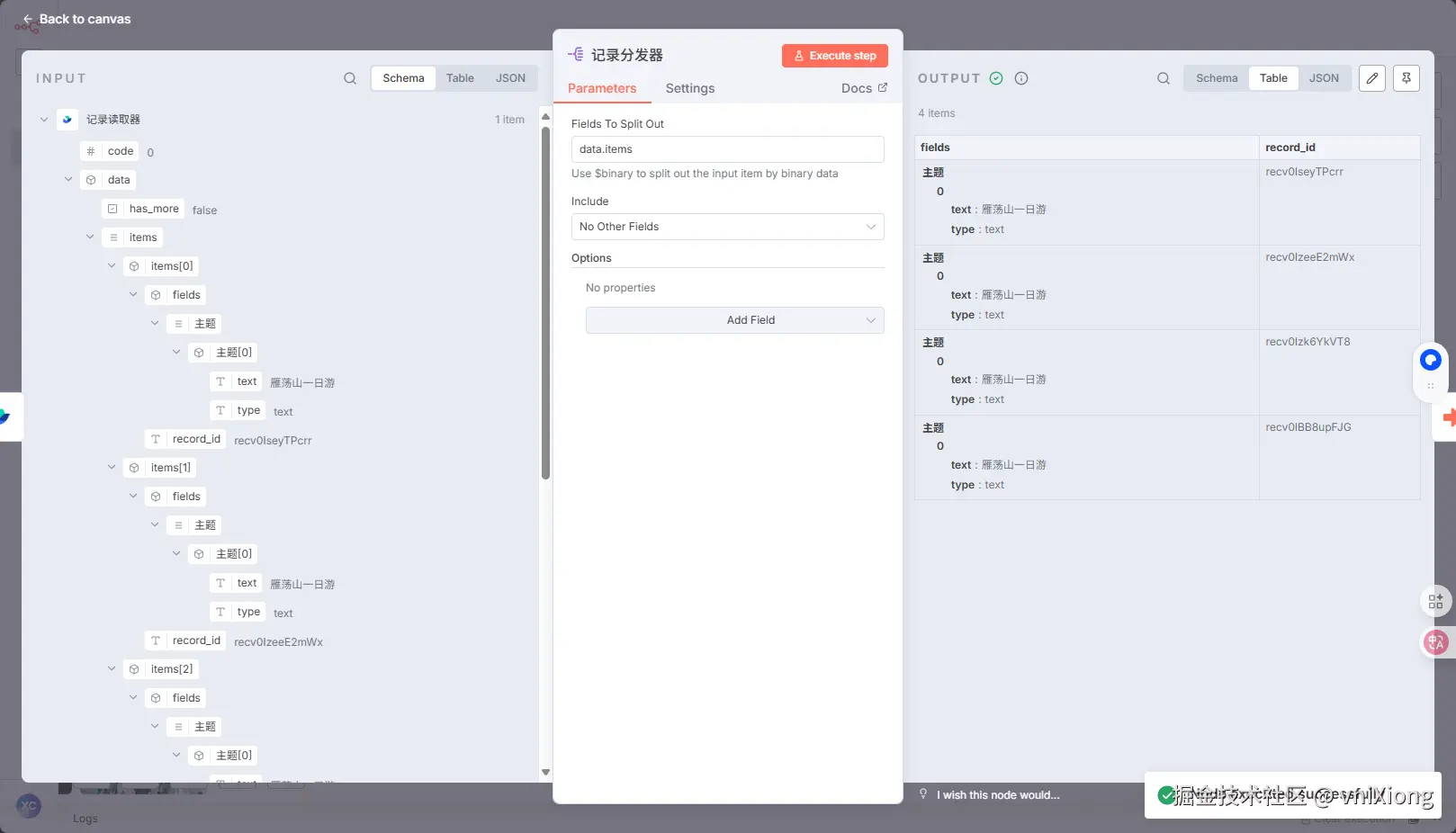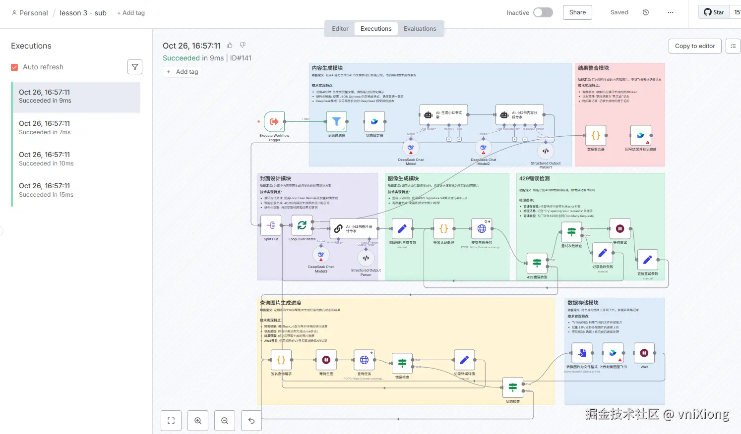 通过飞书触发一下主工作流,然后自动执行子工作流结果如下:(有四条记录,所以子工作流 执行了四个,且是同时执行的,这也体现出了子工作流的优势,就是并行批量执行。)