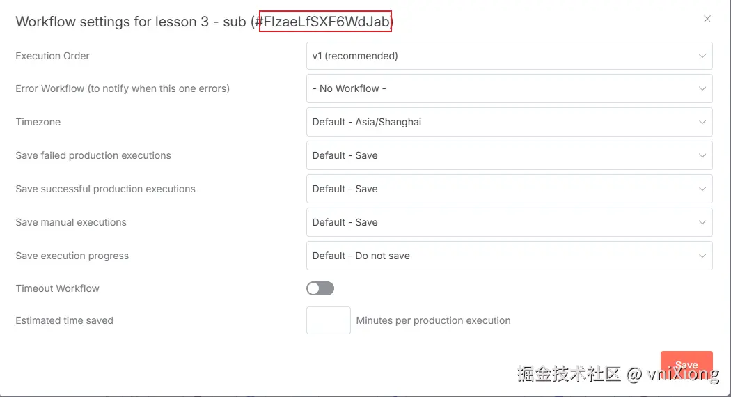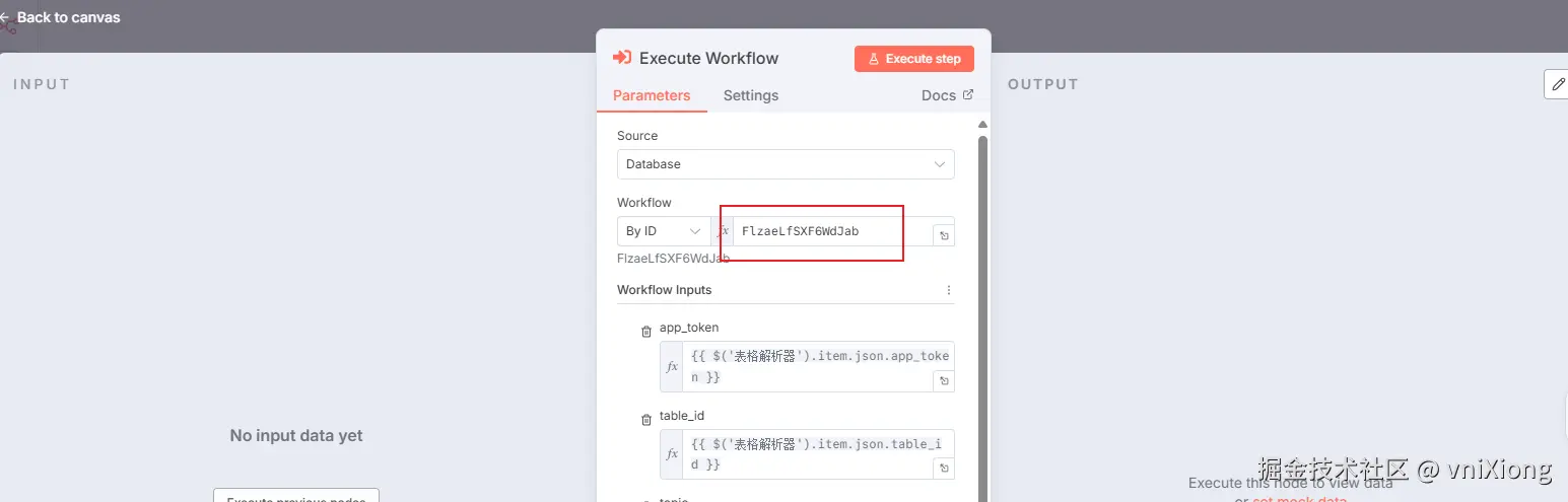 然后回到主工作流,在最后一个节点中配置刚刚获取的子工作流 workflow 的id 即可。
