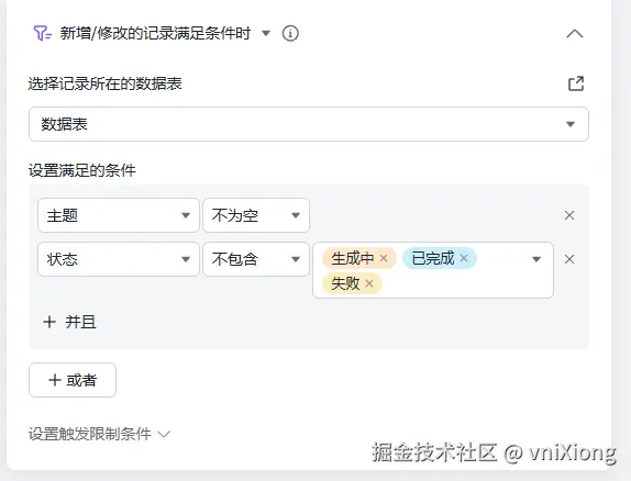 其中,对于过滤条件的设置如下:也就是把触发器中的条件用代码翻译了一下:可以参考飞书的开发文档来配置:记录筛选参数填写说明 - 服务端 API - 开发文档 - 飞书开放平台