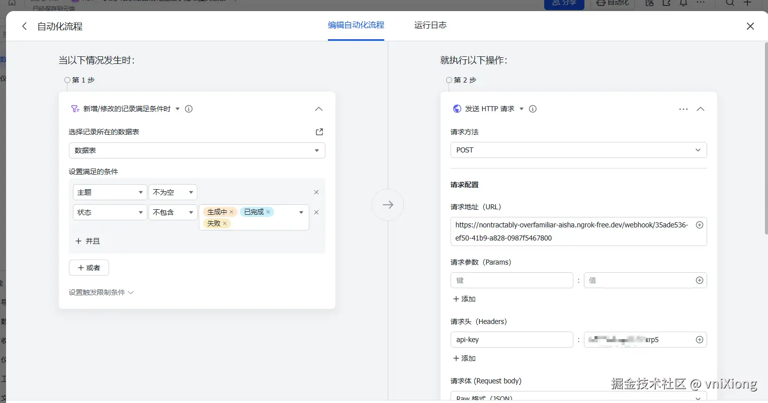 按照上方的配置配置就可以,其中请求URL 就是我们上面拼接出来的url,请求头 就是我们在 飞书多维表格 Header Auth account 配置的 name 和value。点击保存并启用。