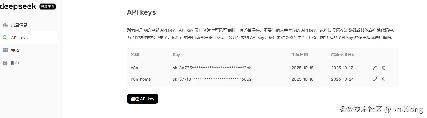 - 获取 API Key (妥善保存,不要硬编码,如果不小心泄露,直接在这里删除掉,再新建一个key即可。)