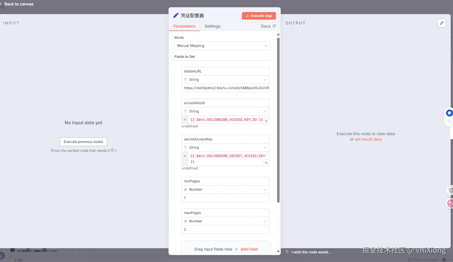 新建一个 workflow,然后添加一个 edit fields 节点,重命名为凭证配置器。