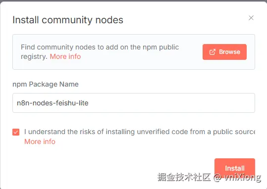 输入要安装的节点名“n8n-nodes-feishu-lite”,勾选同意,Install安装。