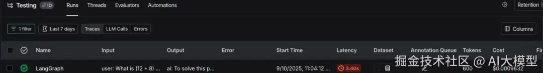我们可以看到智能体使用了工具的响应 ‘The answer is 60’,并且在回答问题时没有产生幻觉。现在让我们查看 LangSmith 仪表板。