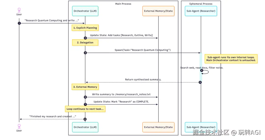 - 分层委托,启动子智能体:协调者进入分层委托阶段,针对 “Research Quantum Computing” 子任务,生成专用子智能体(Sub-Agent: Researcher),并向其下发任务。子智能体(研究员)启动专属内部循环:Search web, read docs, filter noise。