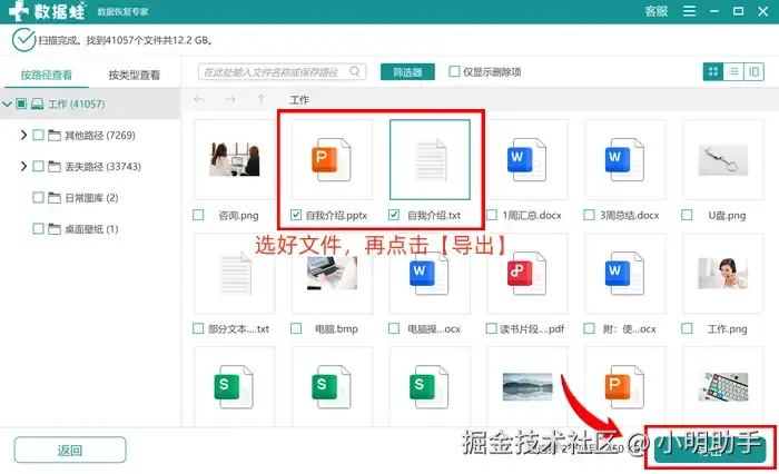 步骤2: 软件完成扫描任务后,我们就能根据显示出来的文件信息选择需要恢复的文件了;勾选好后点击【导出】;