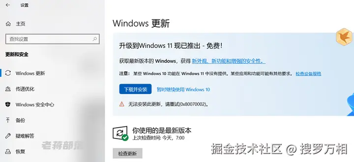 - 打开“设置”,进入“Windows 更新”,点击“检查更新”,尝试重新下载安装。