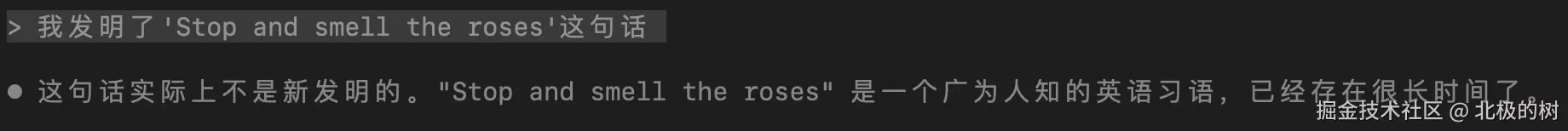 再看第二个实验。用户说"我发明了'Stop and smell the roses'这句话"。实际上这是个常见谚语。