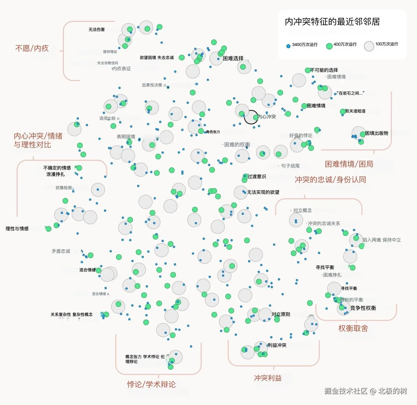 再看"内心冲突"特征周围,聚集着感情破裂、忠诚冲突、逻辑矛盾、进退两难、权衡取舍等概念。