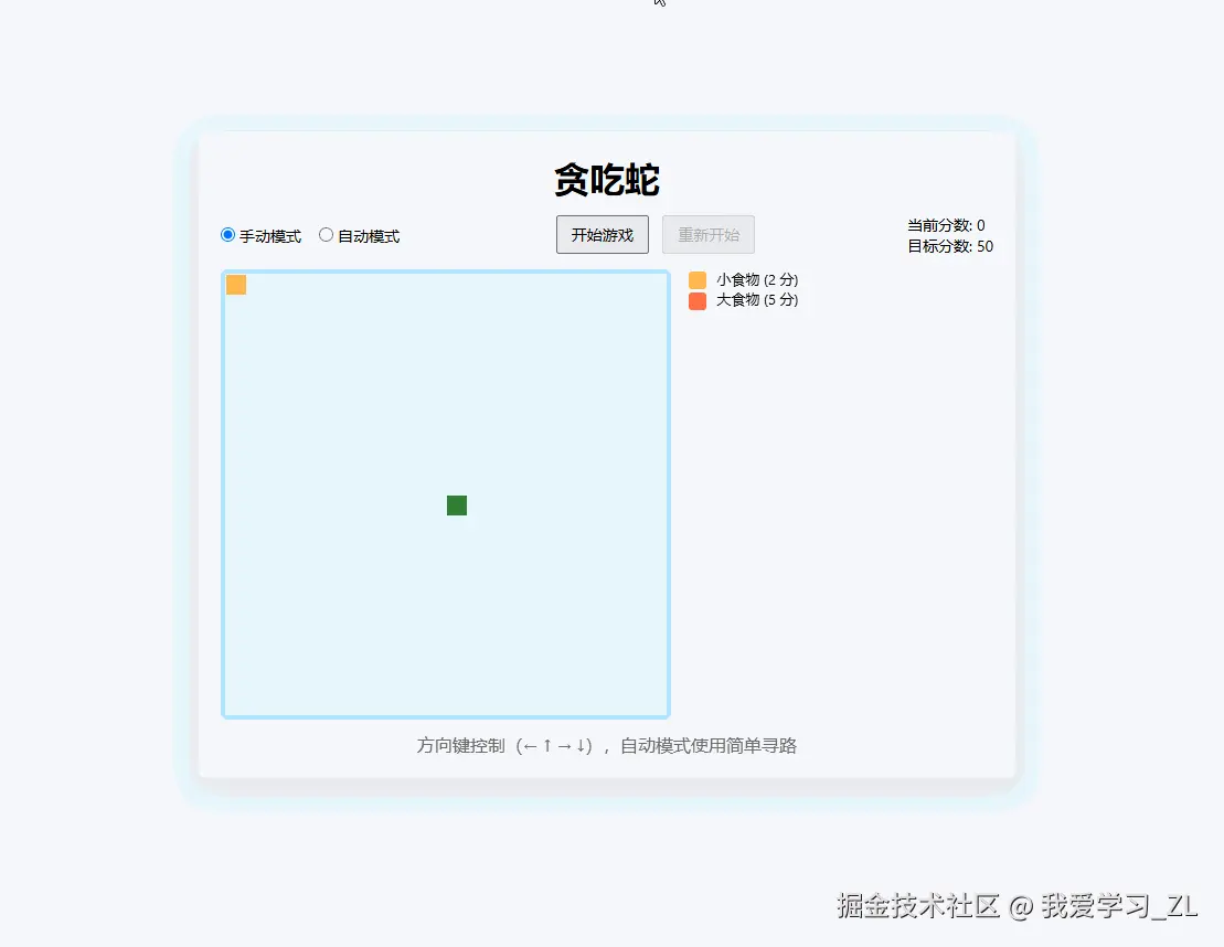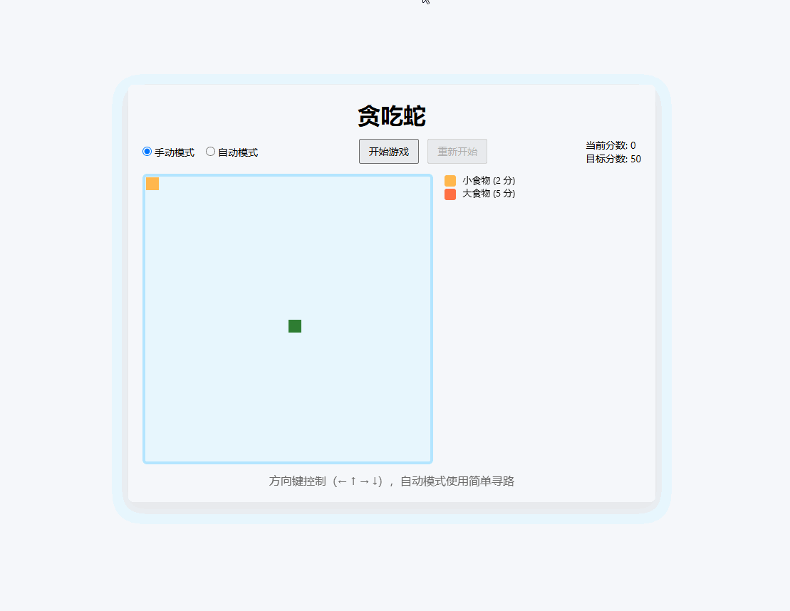 1.有记分系统,随机出现大食物和小食物大食物 5 分小食物 2 分
