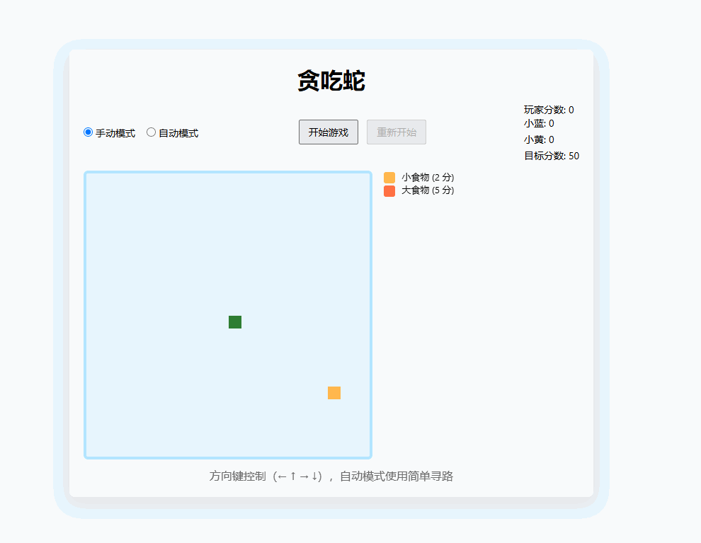 自动模式下出现两条蛇,分别是小蓝和小黄谁得到 50 分就获胜