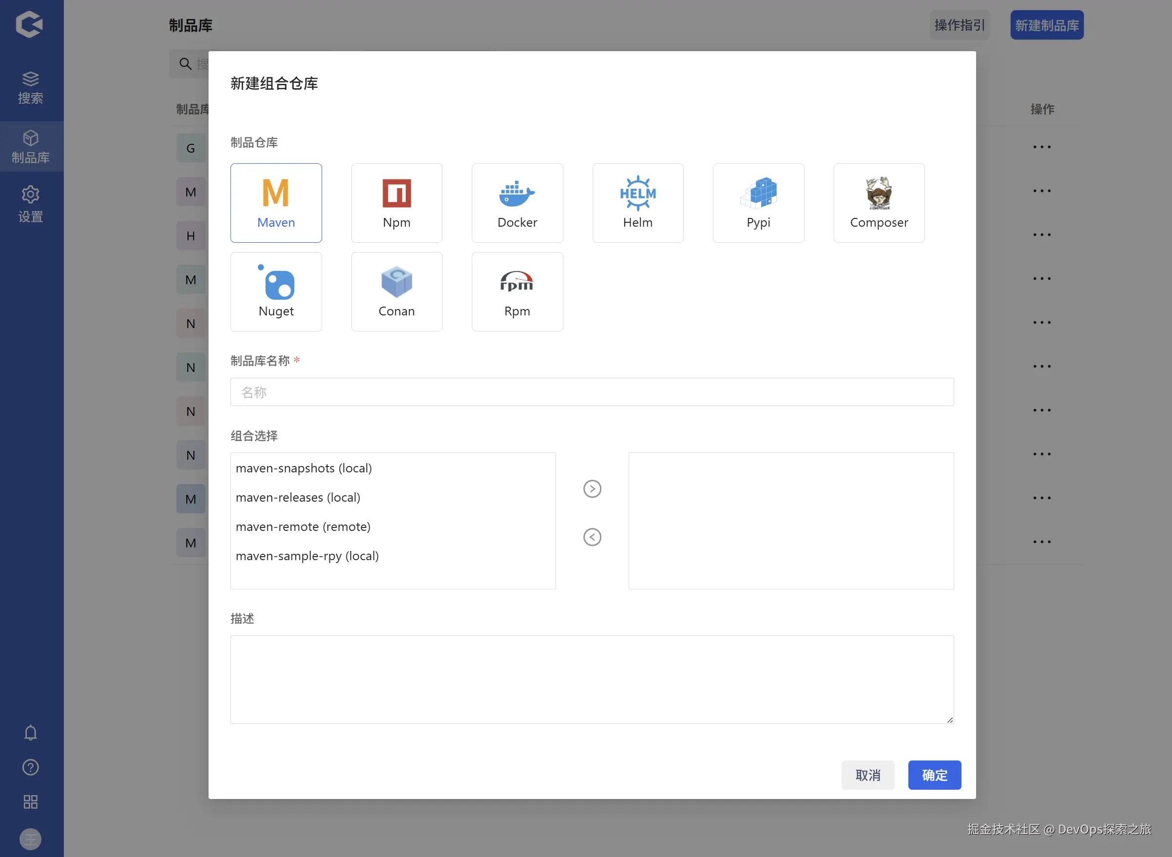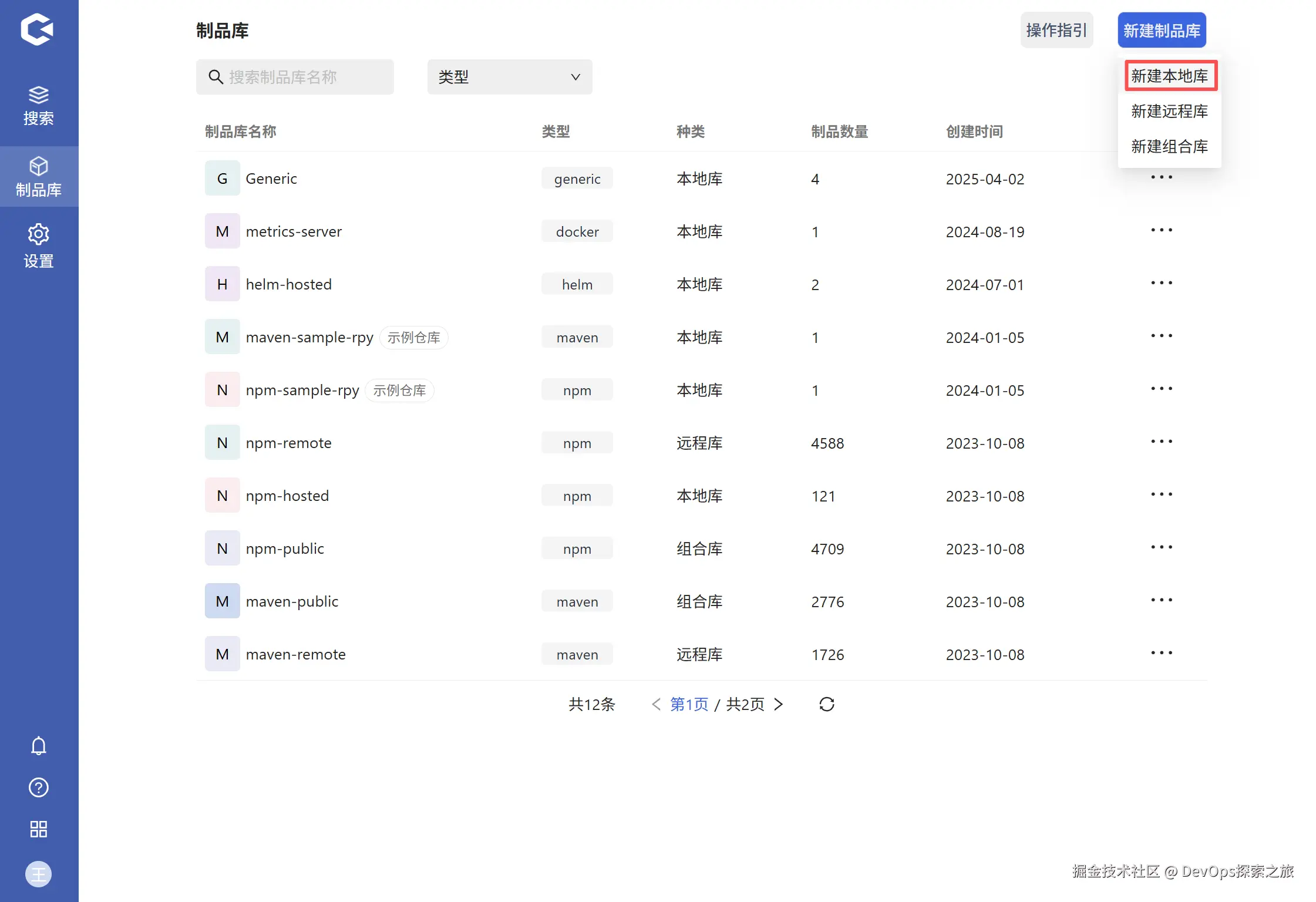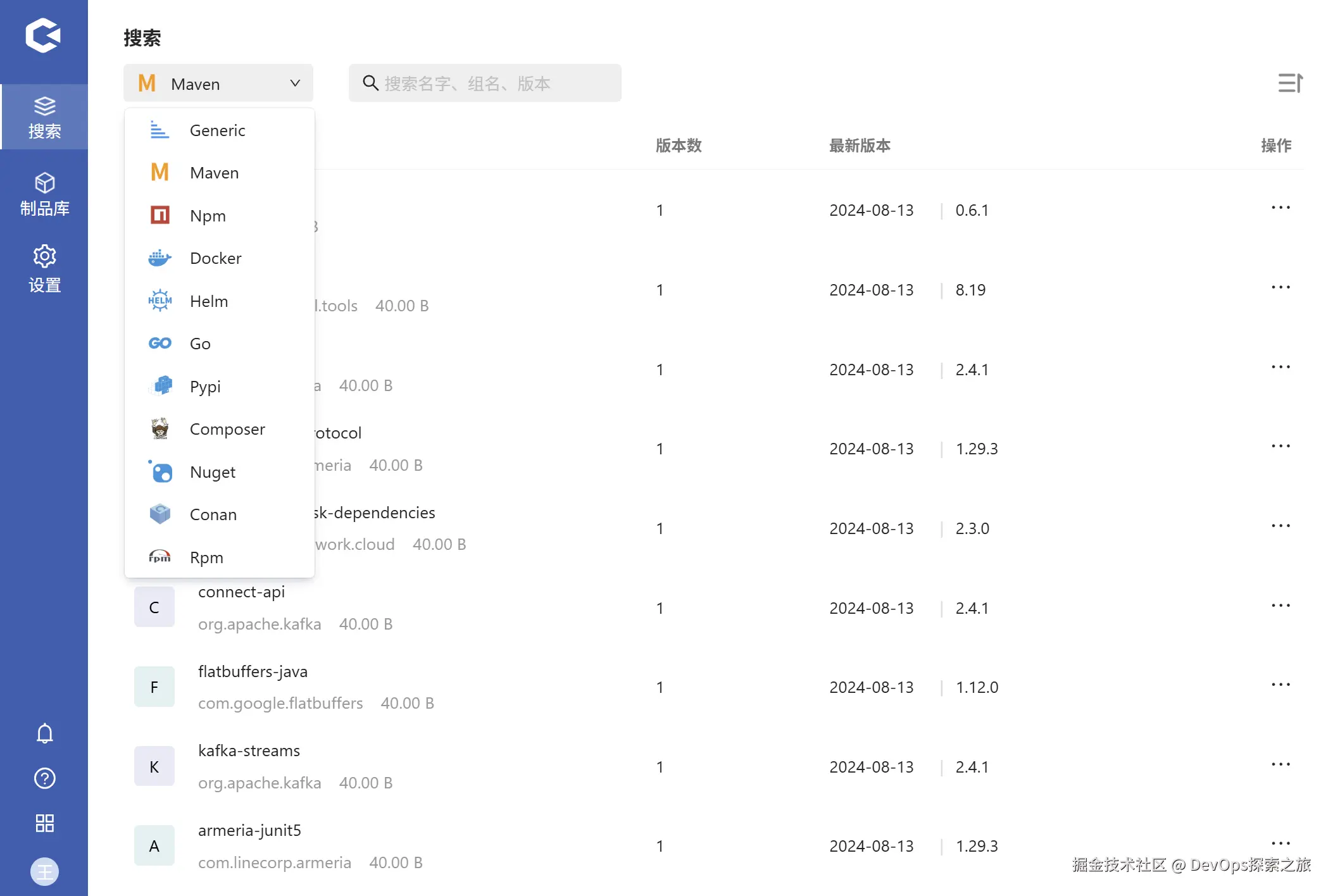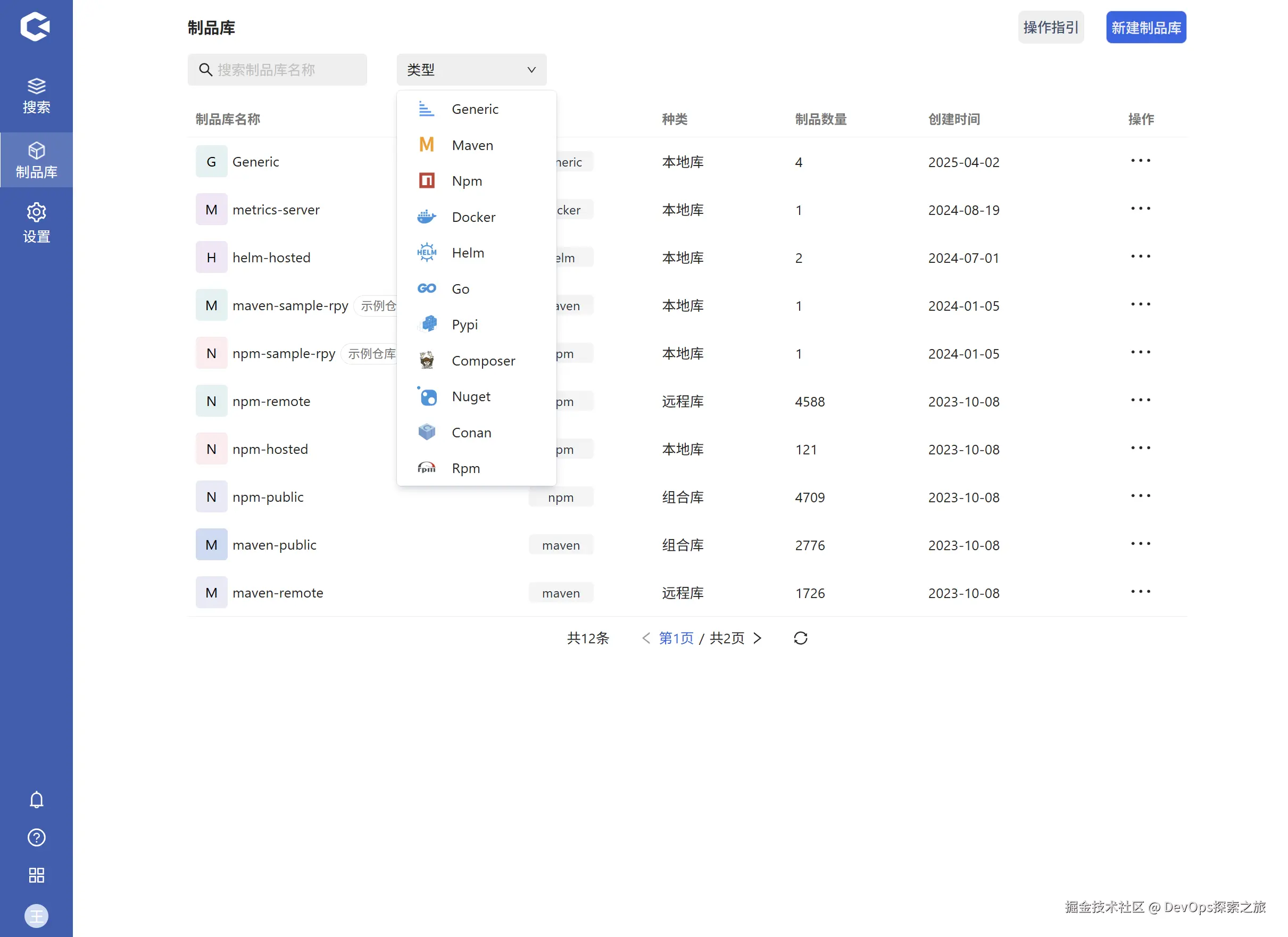 支持制品类型如:Generic、Npm、Docker、Maven、Helm、Go、pypi、composer、nuget、Conan、Rpm。
