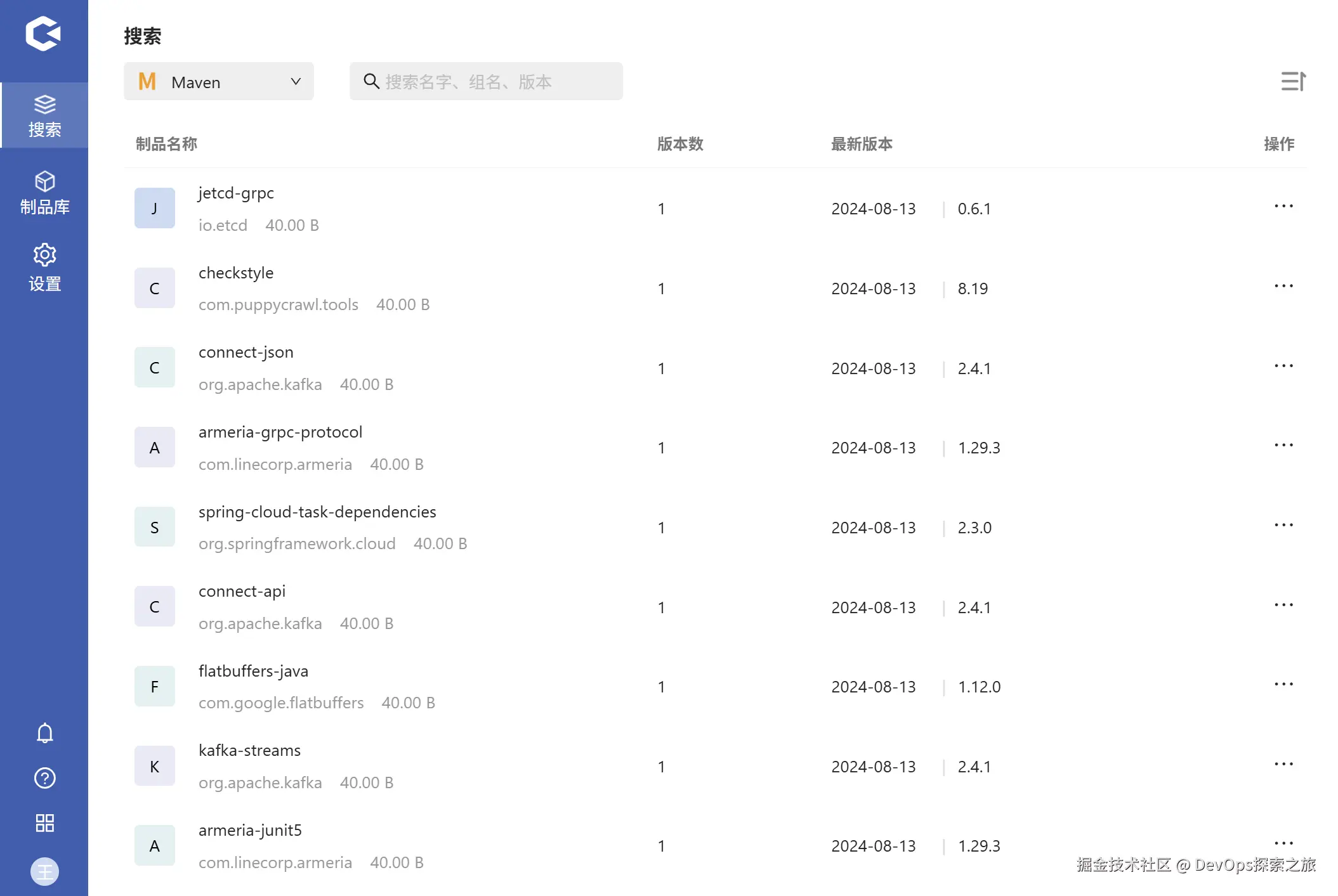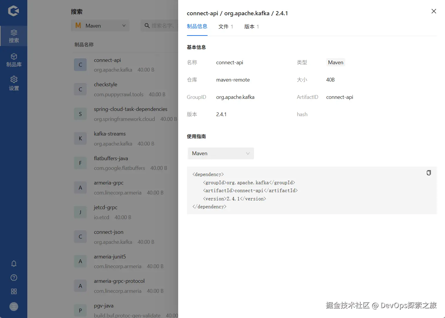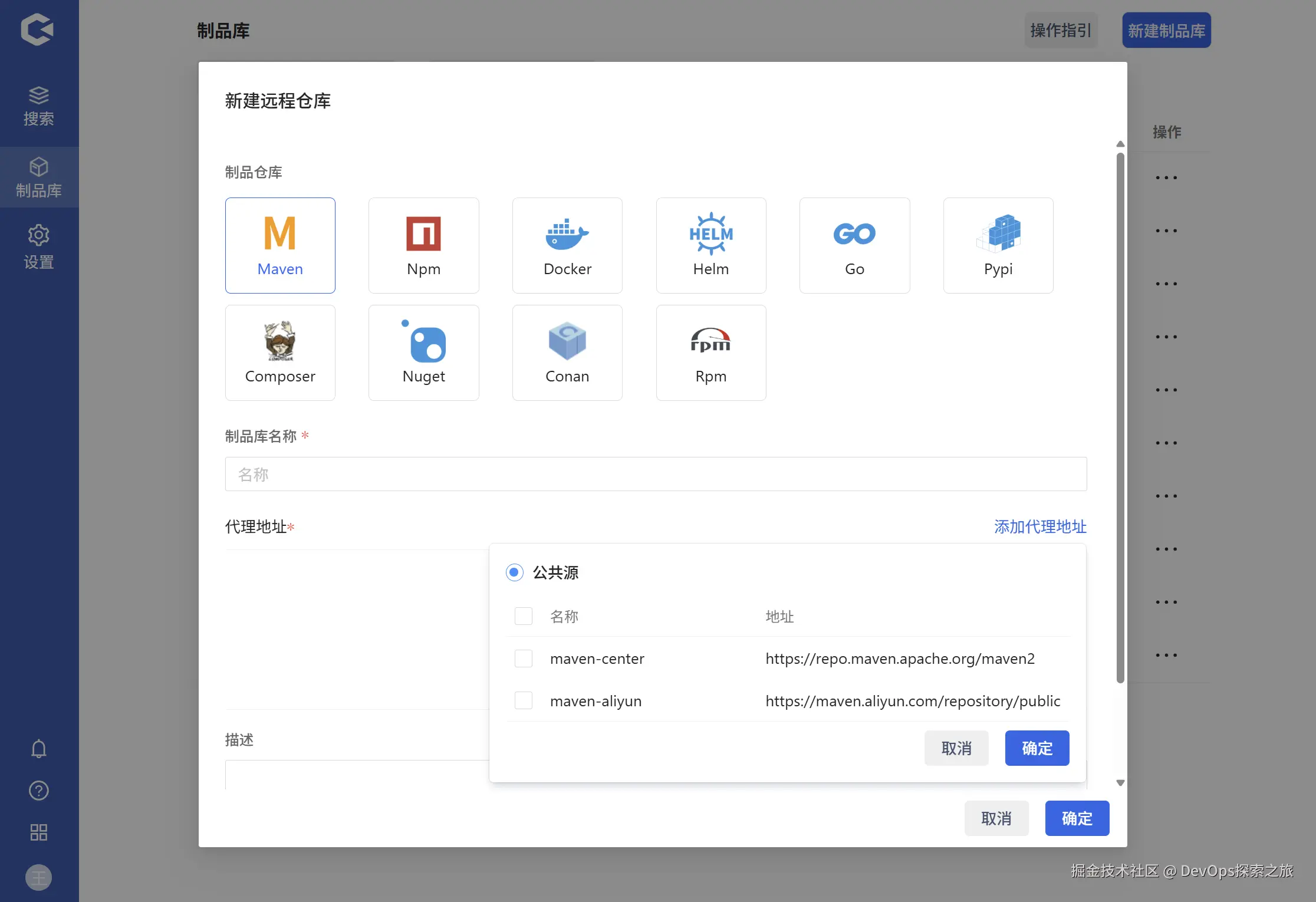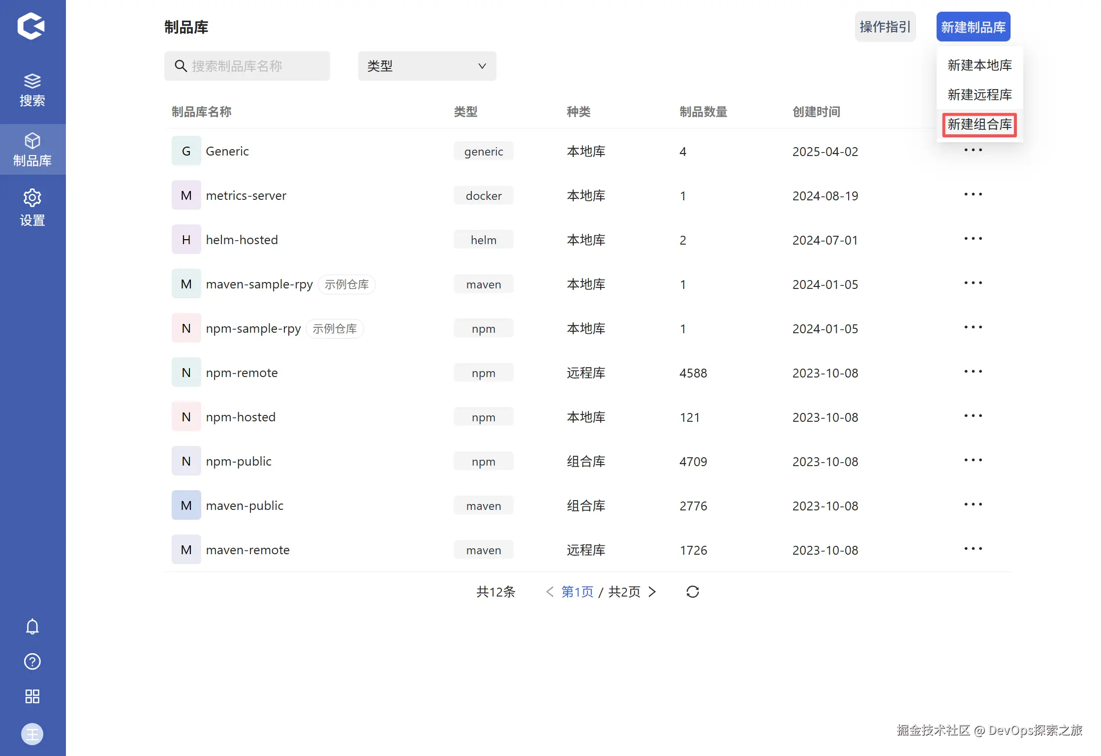 支持制品类型如:Generic、Npm、Docker、Maven、Helm、Go、pypi、composer、nuget、Conan、Rpm。