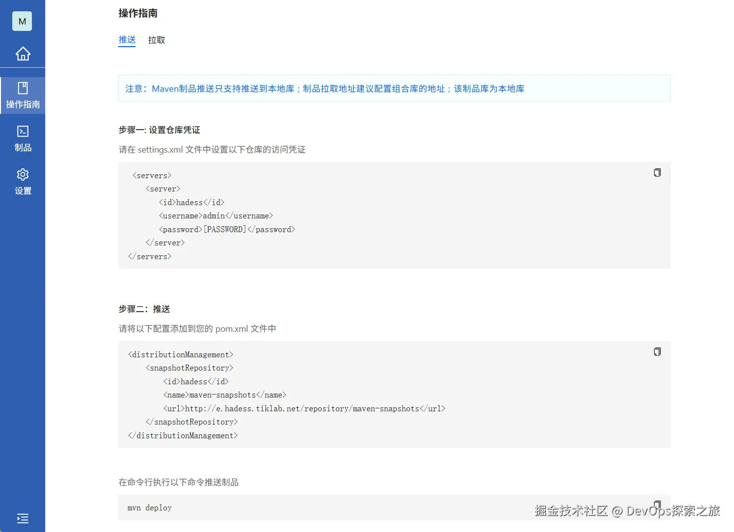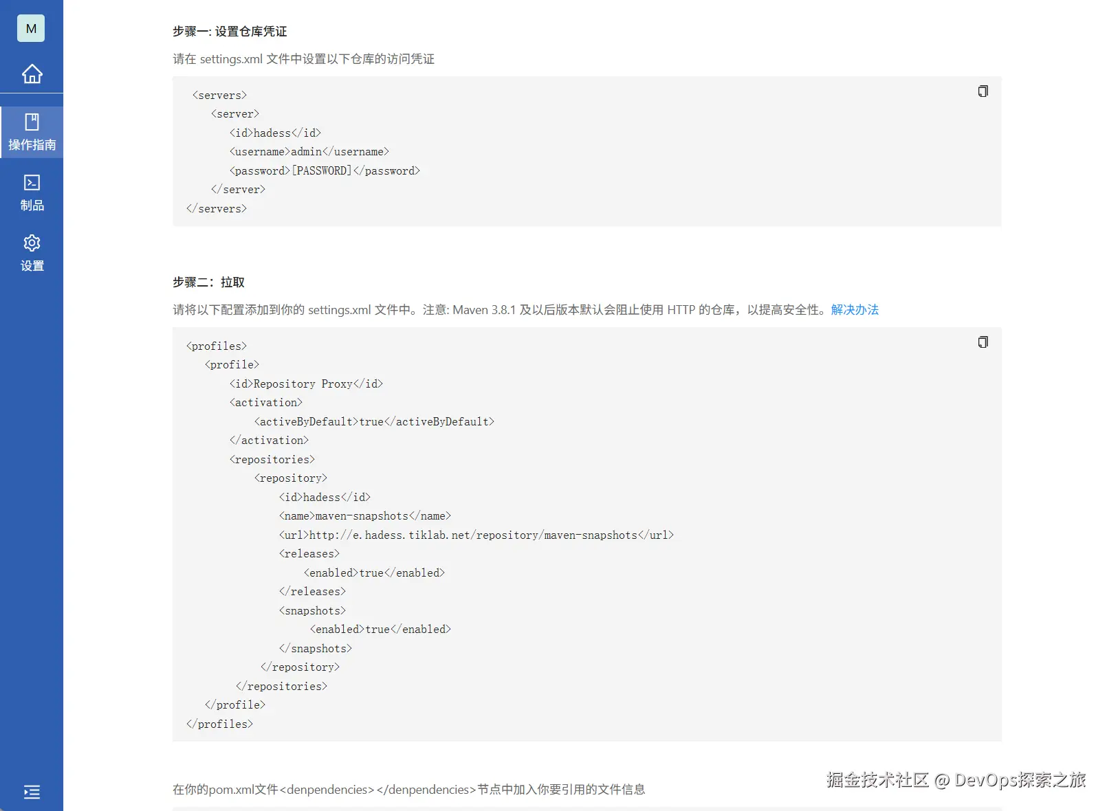 进入制品库界面点击右上角操作指引选择maven进入操作指引界面,替换对应的文本。将其添加至 settings.xml 文件中。