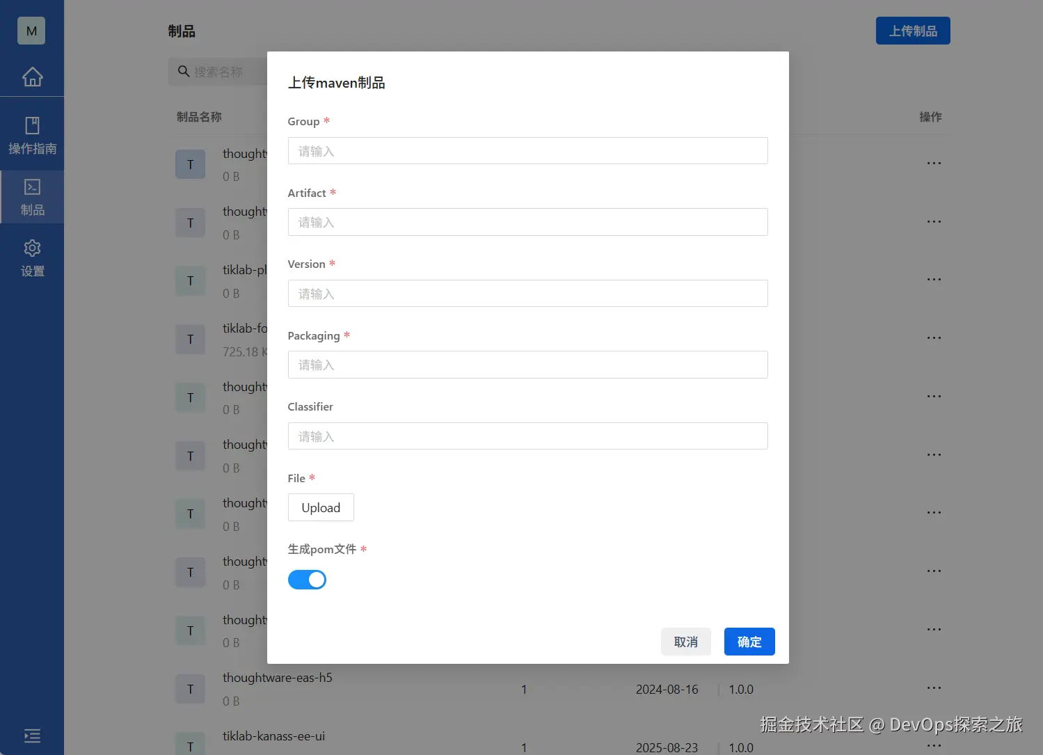 即可在maven制品库库制品界面点击右上角上传制品,只有本地local库可以上传界面上传适用于第三方只有 jar 包或者压缩文件,不适用于自己有pom.xml文件。