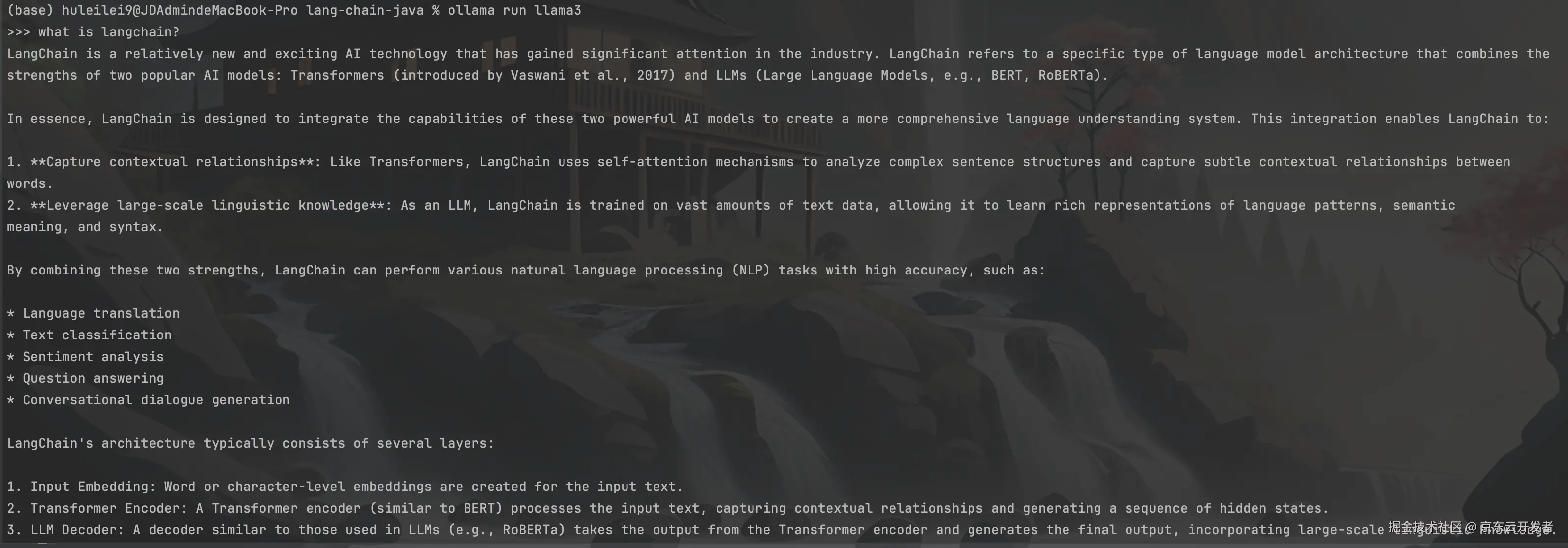 上面说的 LangChain 是基于python 开发的,而 LangChain4J 是一个旨在为 Java 开发者提供构建语言模型应用的框架。受到 Python 社区中 LangChain 库的启发,LangChain4J 致力于提供相似的功能,但针对 Java 生态系统进行了优化。它允许开发者轻松地构建、部署和维护基于大型语言模型的应用程序,如聊天机器人、文本生成器和其他自然语言处理(NLP)任务。