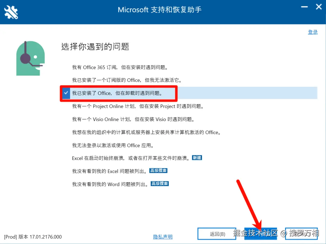 选择【我已经安装了office,但在卸载时遇到问题】然后点击【下一步】