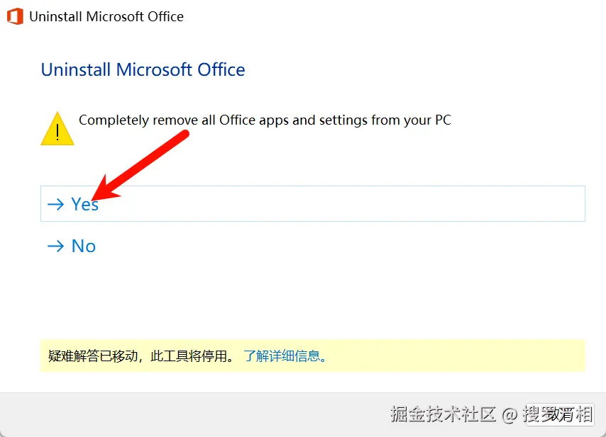 检测完成后,让我们确认是否彻底卸载office,点击【yes】,程序开始自动卸载,这里会花点时间
