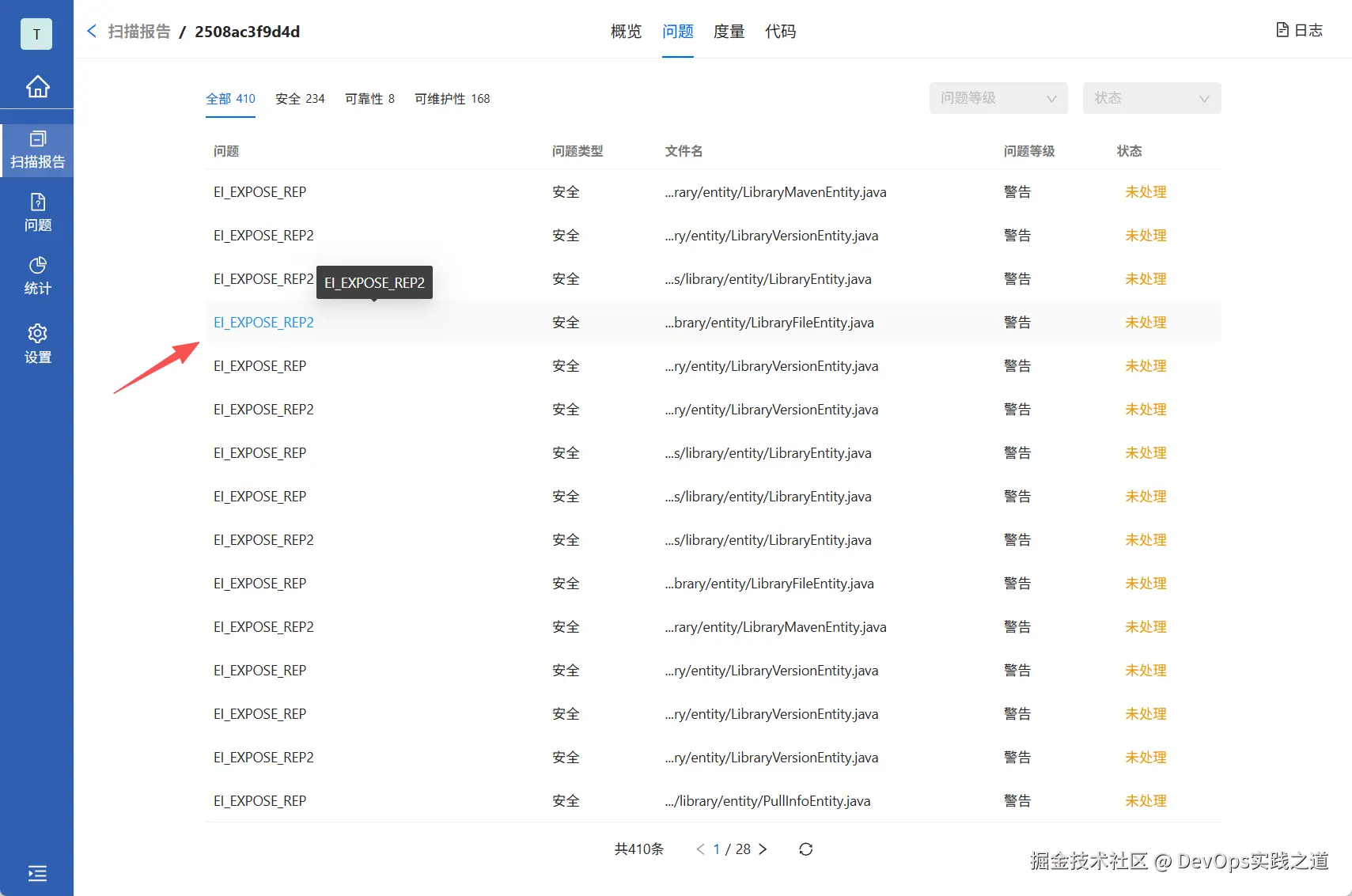 点击问题TAB显示当次扫描历史出的所有问题列表。点击问题编号可查看详细问题描述。