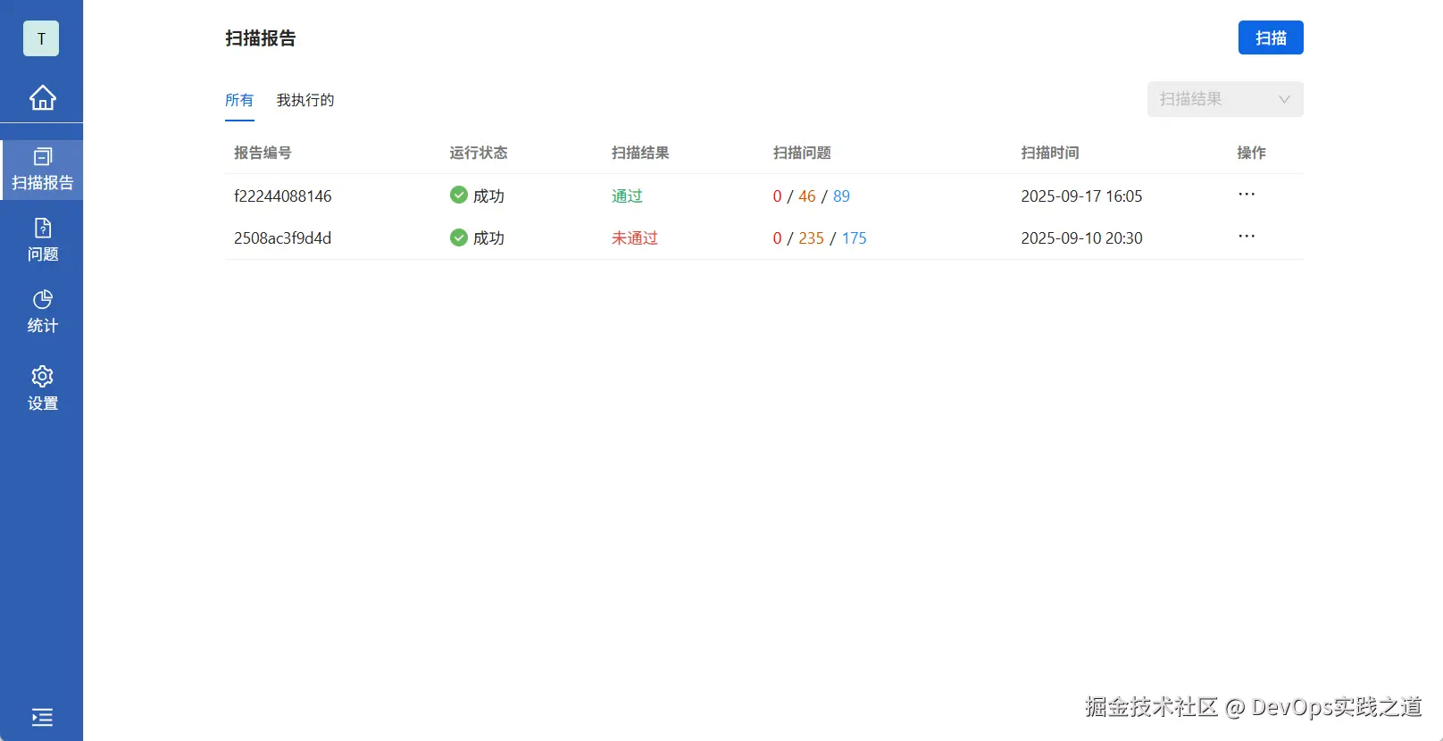 扫描完成后在扫描报告页面显示代码扫描历史列表。