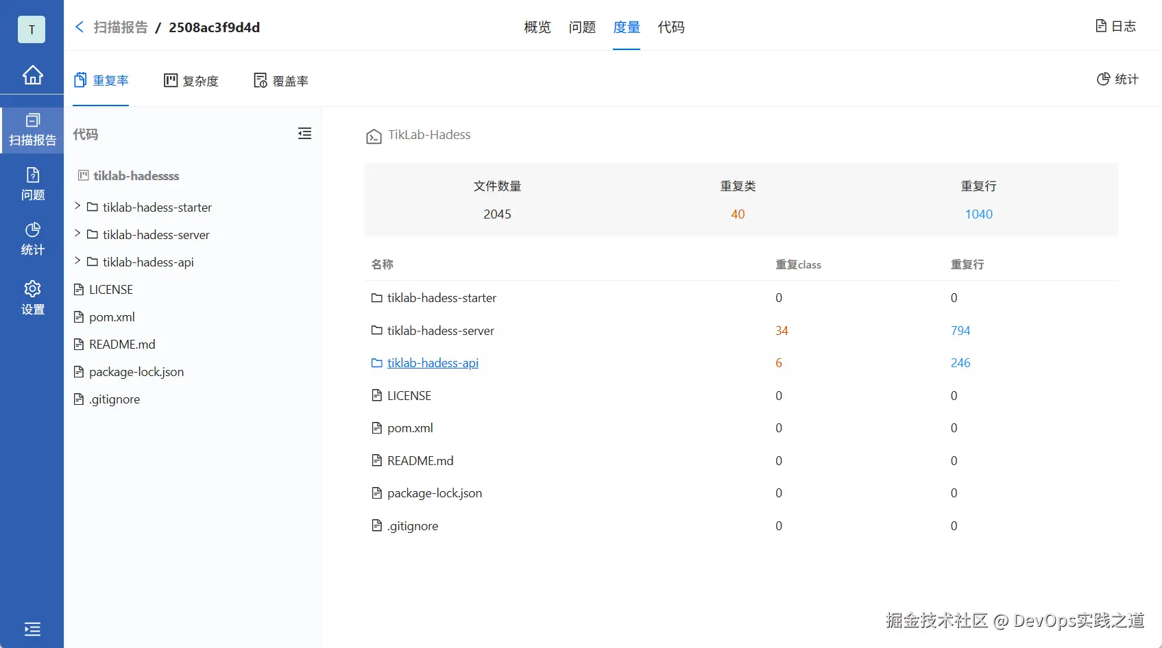 在度量TAB可显示当前代码扫描历史的重复率、复杂度、覆盖率等报告。