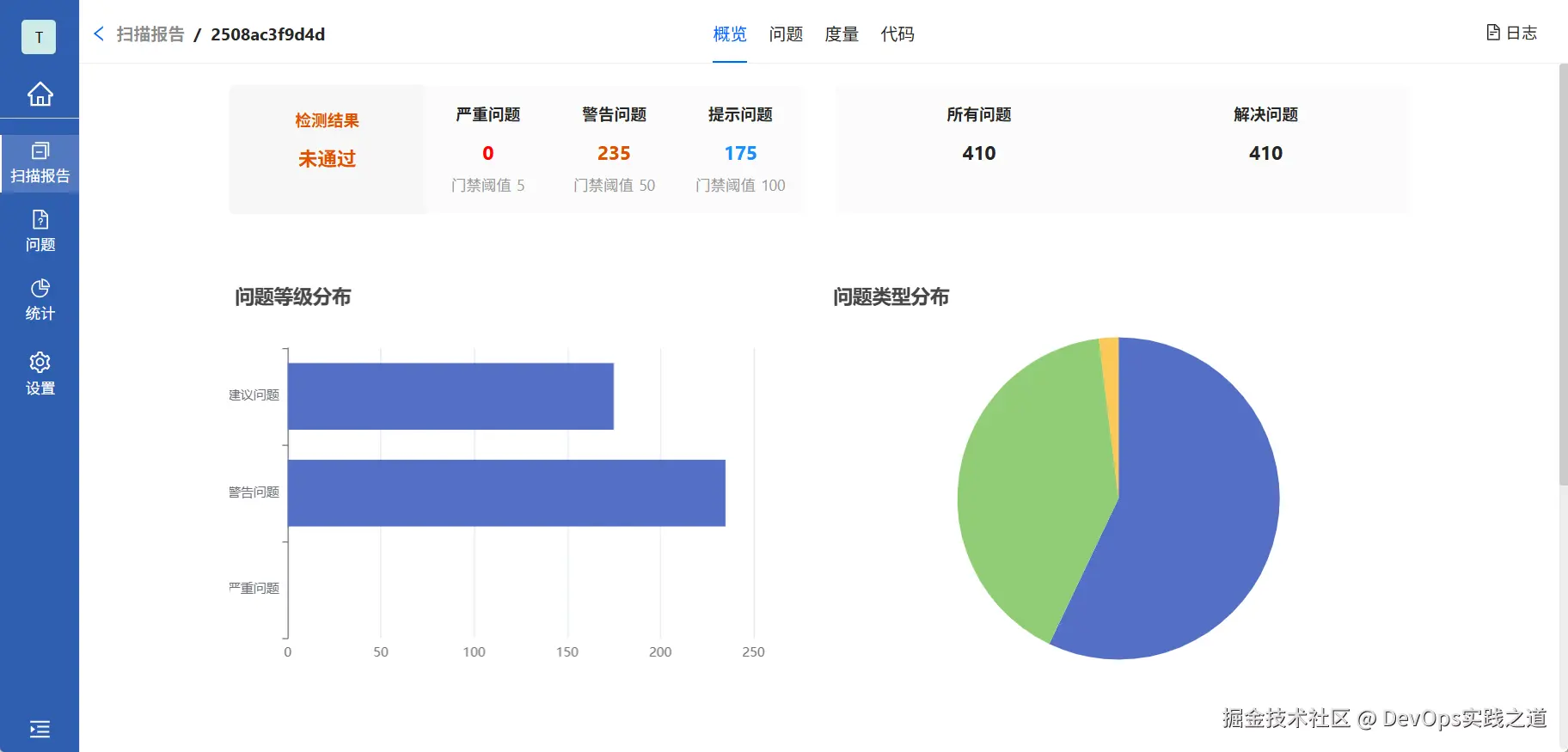 点击相应代码扫描编号,查看详细报告。代码扫描报告首页展示报告概览,通过扫描出的问题和设置的阈值展示代码扫描结果。