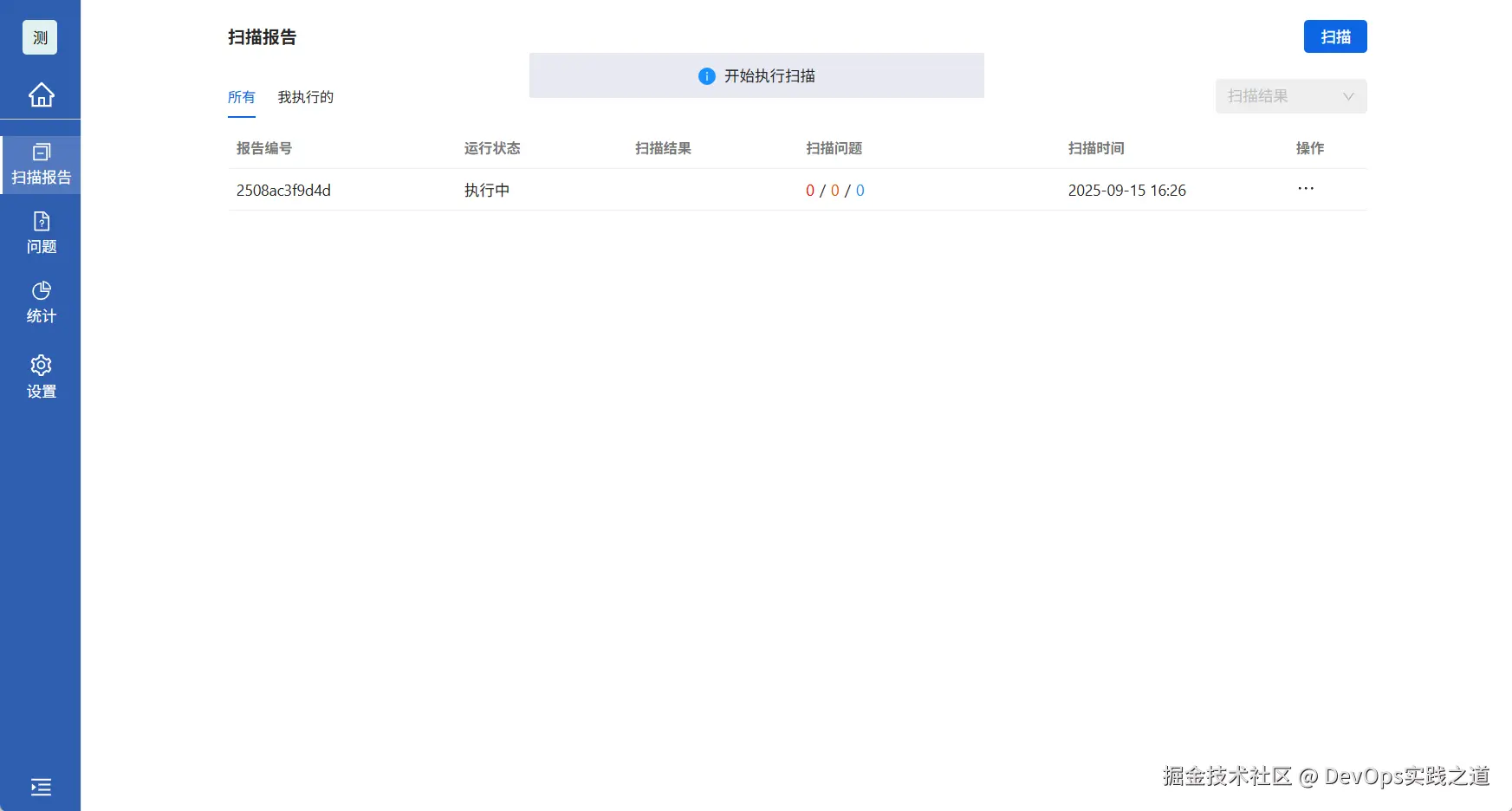 代码上传完成后,点击右上角扫描按钮,进行代码扫描。